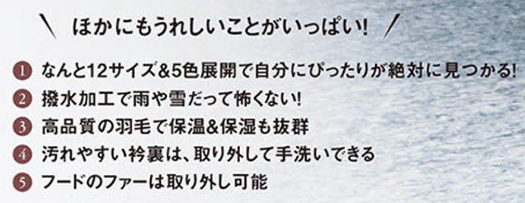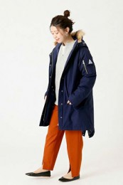 今季の新モデルは、切り替えとウエストのシェイプされたデザインで女らしさ抜群。少しくらい濡れても安心の撥水素材で、フードを取り外して着ることも可能。