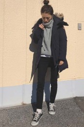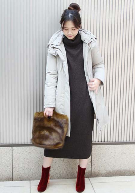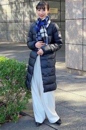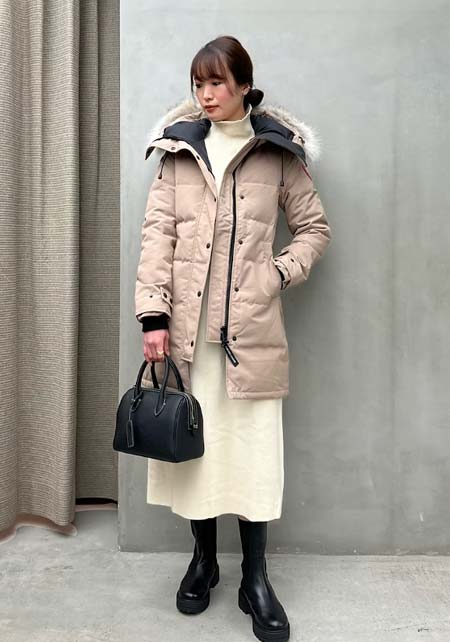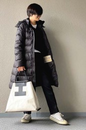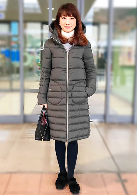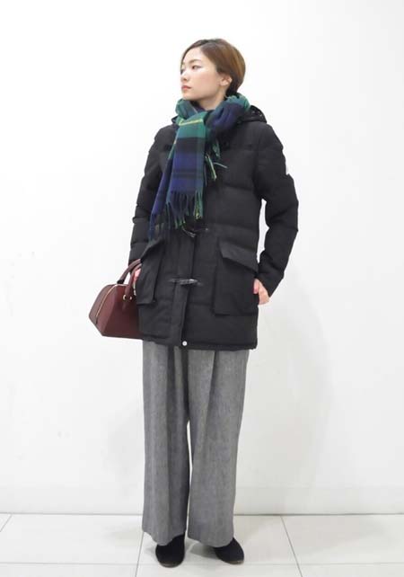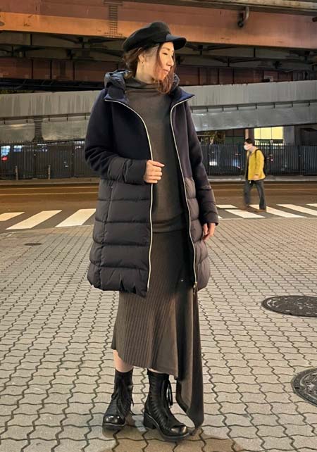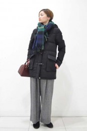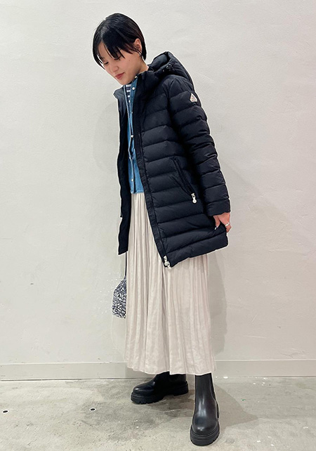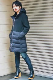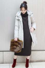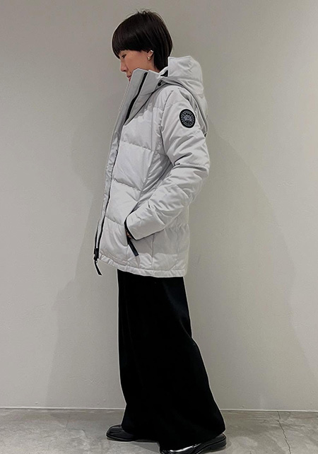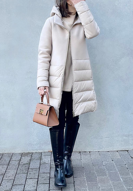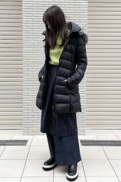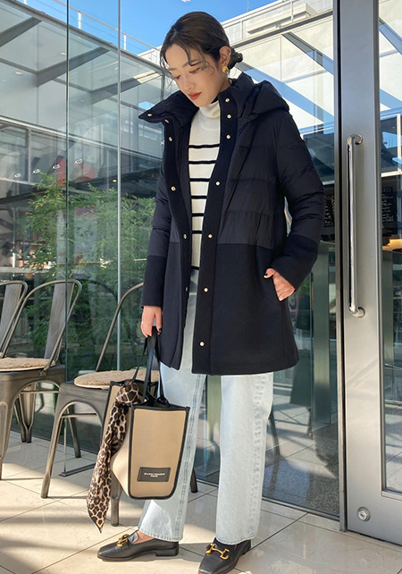 布帛とナイロン素材を組み合わせることで、スポーティすぎないスタイルに仕上げたダウンコート。ショルダーから胸もとにかけて曲線状にステッチを施し、女性らしさを感じさせているのも特徴。ライトグレーのニットワンピースを合わせれば、洗練されたグレーのワントーンコーディネートが完成します。