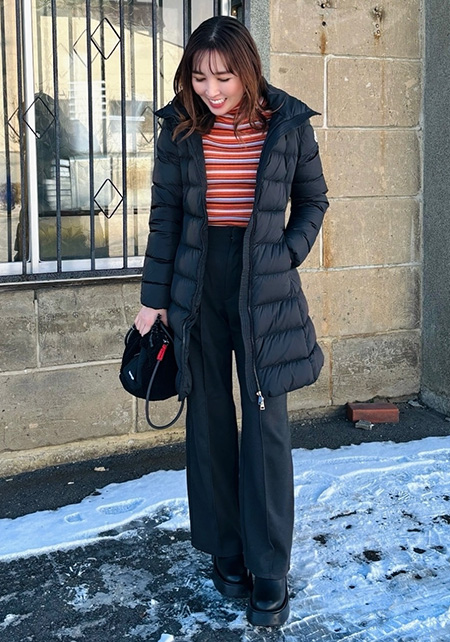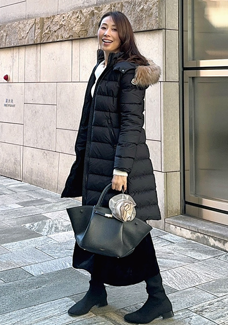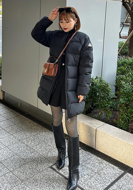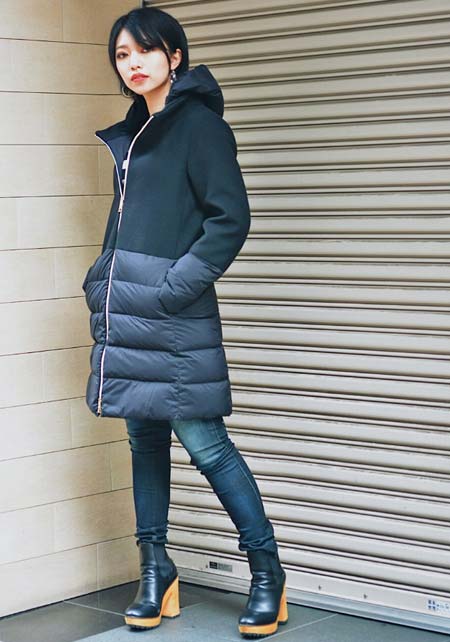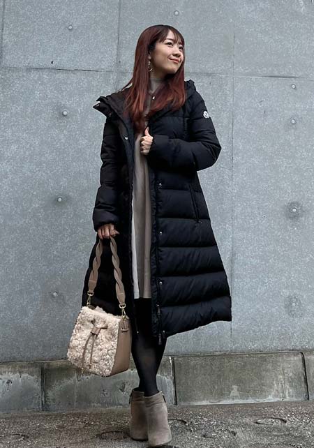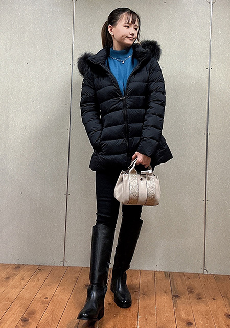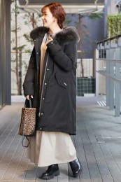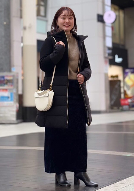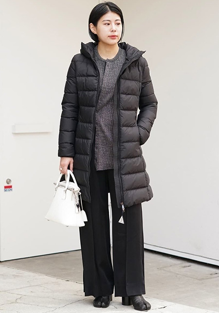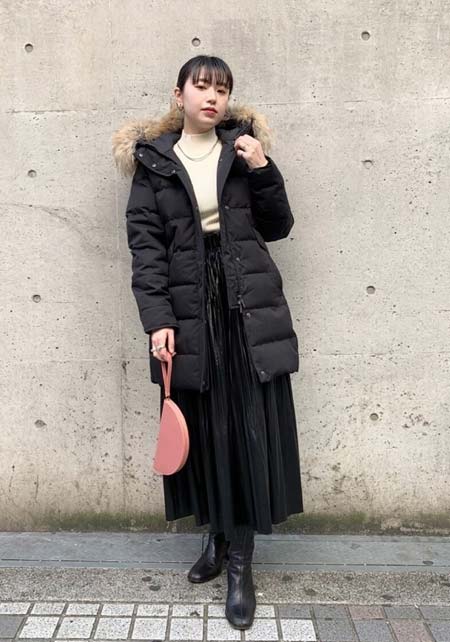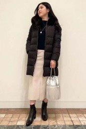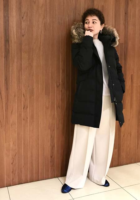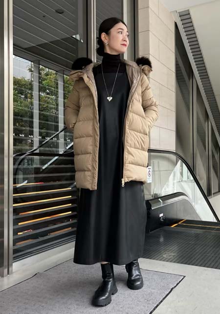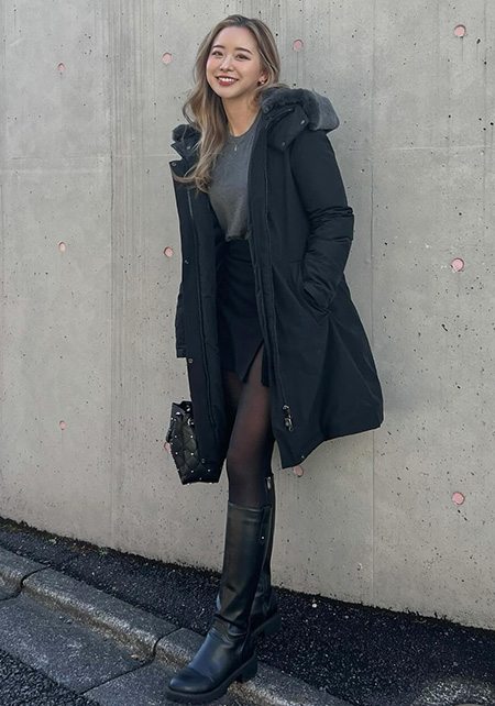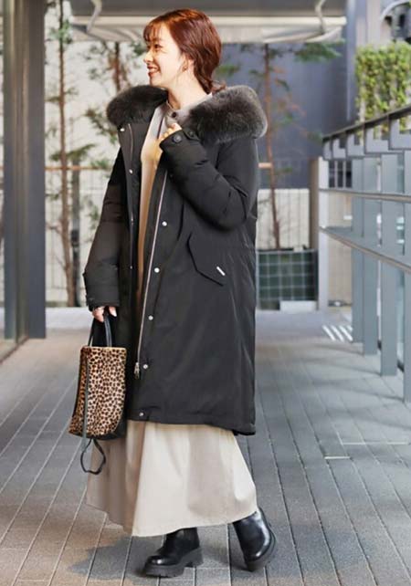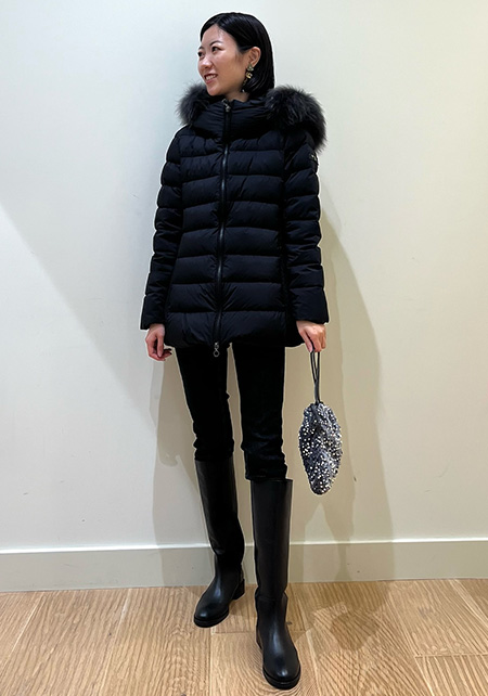〈左〉真っ黒なダウンコートが辛口になりすぎずフェミニンに見えるのは、裾にあしらわれたムートンのアクセントのおかげ。