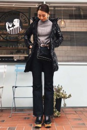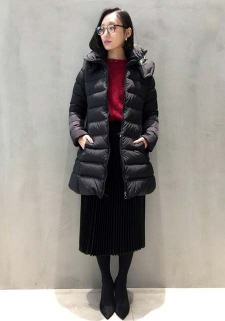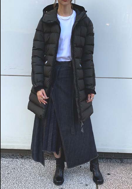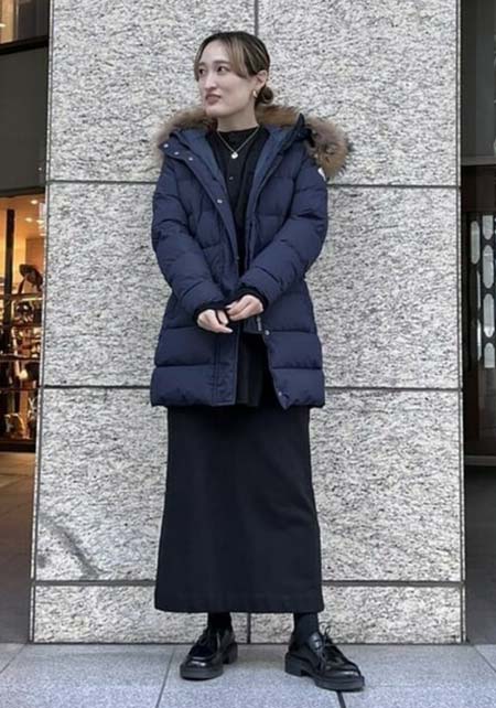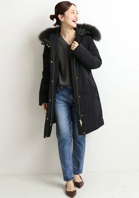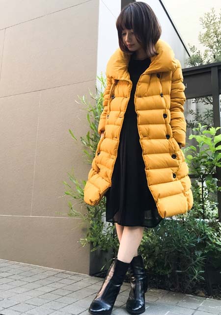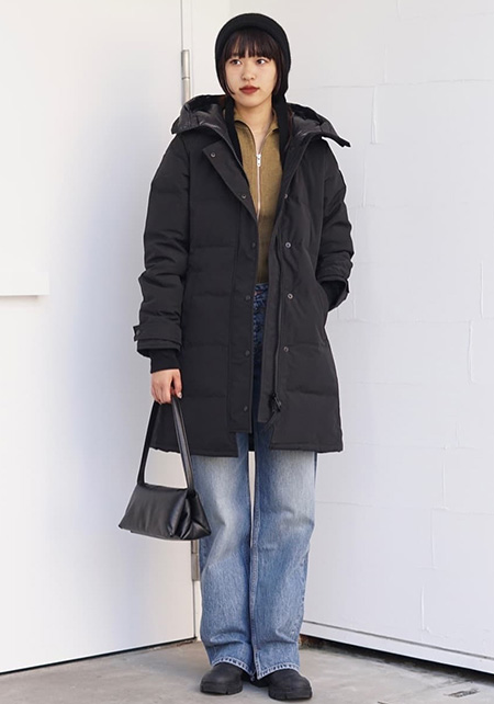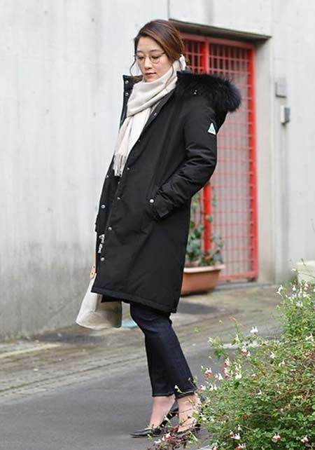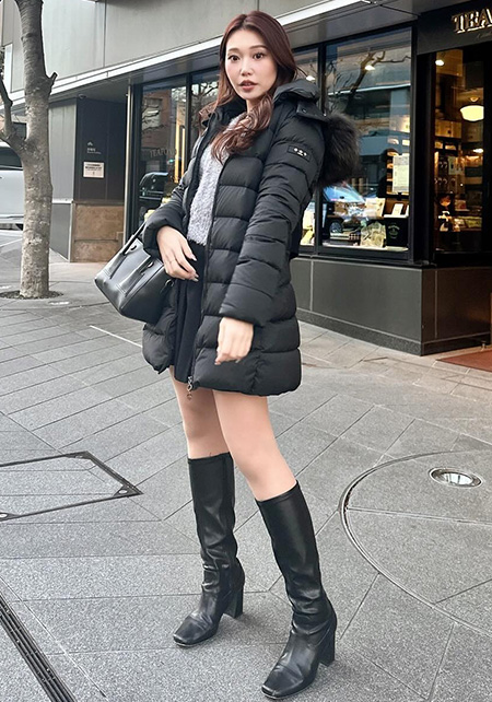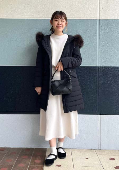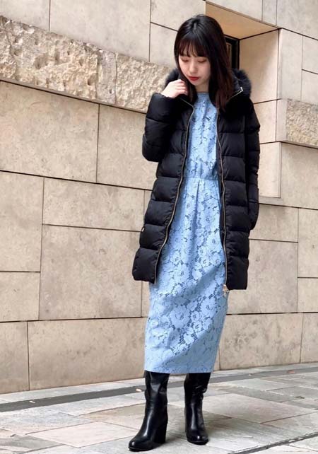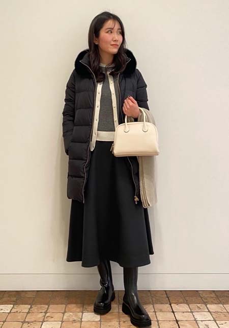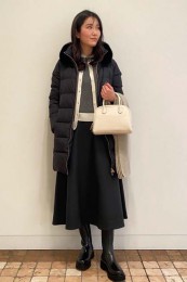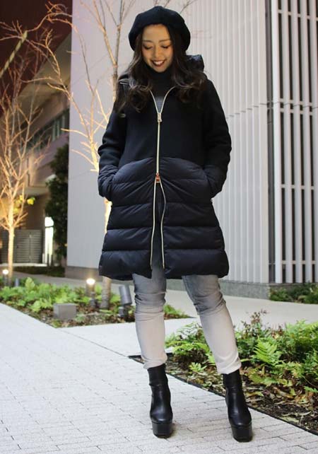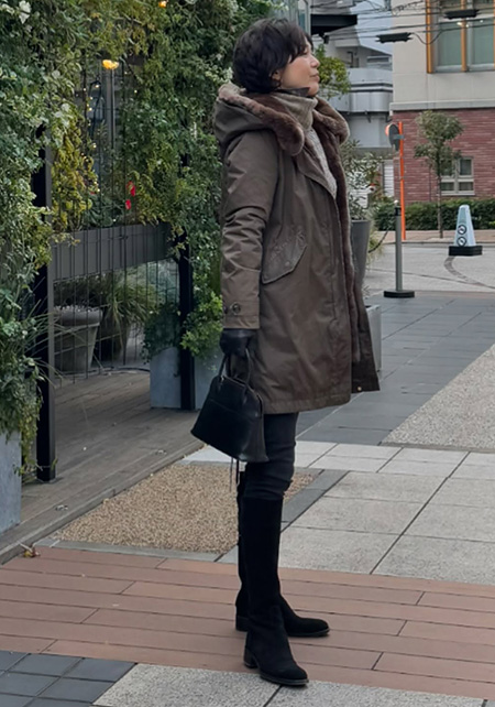 〈左〉真っ黒なダウンコートが辛口になりすぎずフェミニンに見えるのは、裾にあしらわれたムートンのアクセントのおかげ。