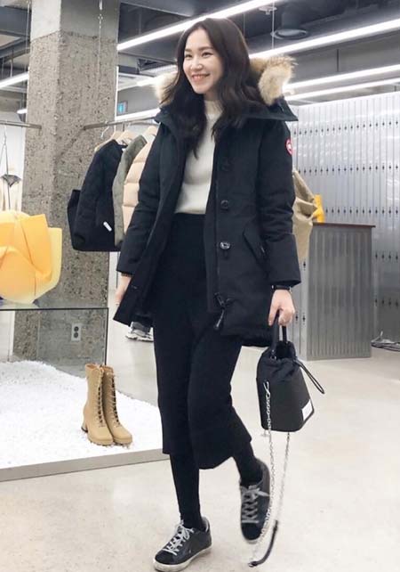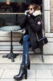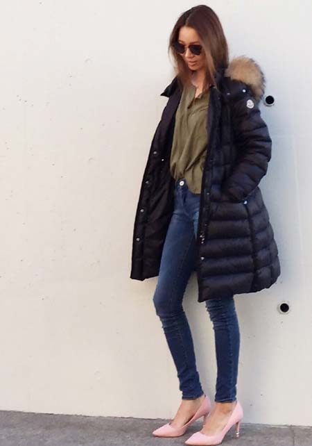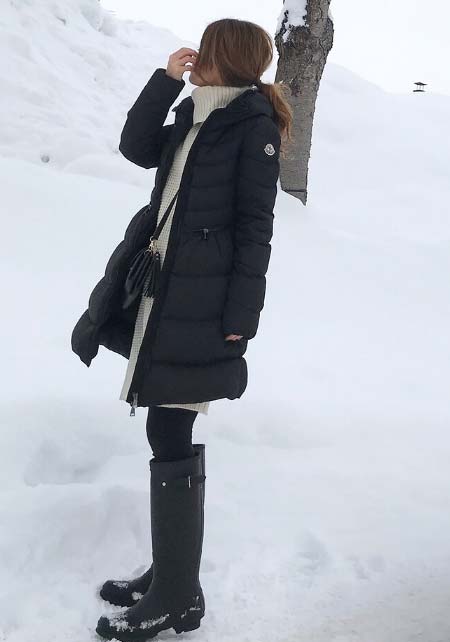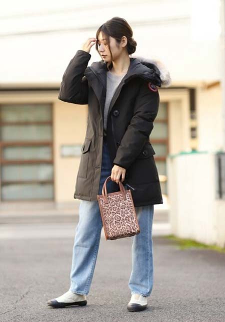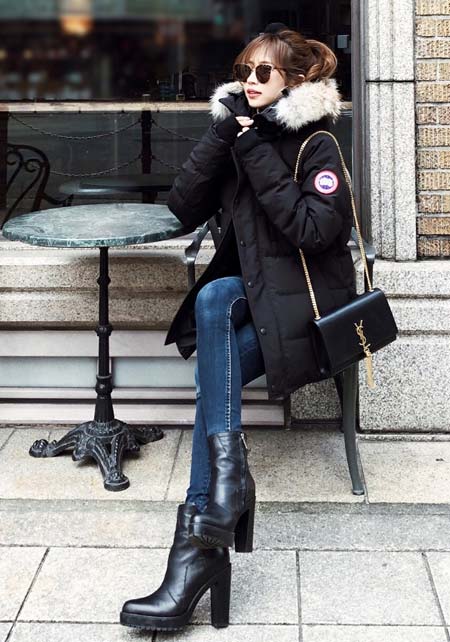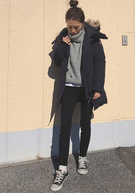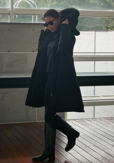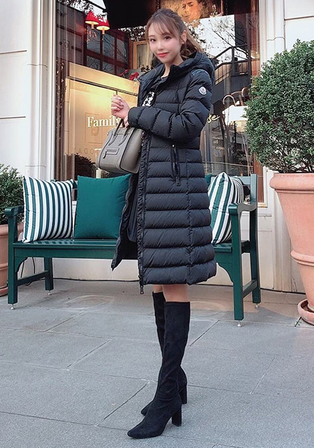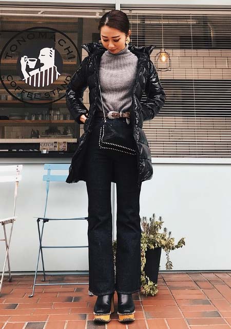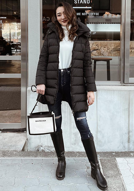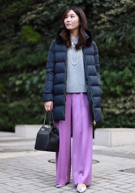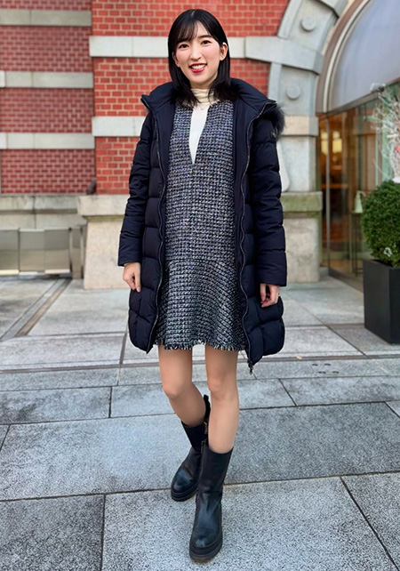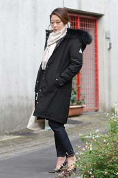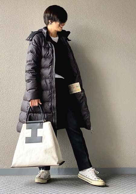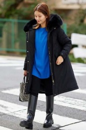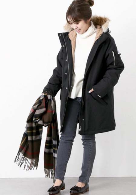 〈左〉真っ黒なダウンコートが辛口になりすぎずフェミニンに見えるのは、裾にあしらわれたムートンのアクセントのおかげ。