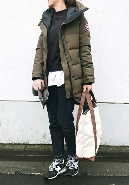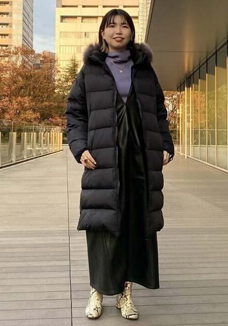 冬のキャンプにも耐えうるヘビーデューティーなロング丈ダウンは、モダンなメタリックカラーををチョイス。女らしい着こなしに羽織ればギャップコーデの感性。