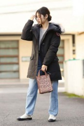 デニムを合わせた少しカジュアル感のあるコーディネートも上質な素材使いでグッと格を上げてくれます。少しゆとりのあるモッズ風シルエットなので、ざっくりニットを着ても響きません。