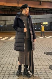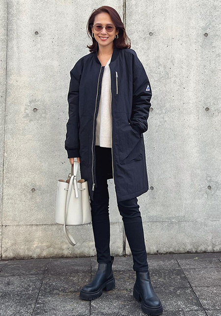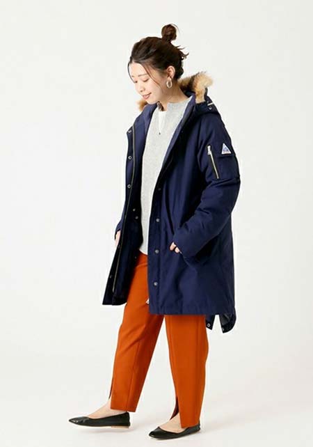 しっかりお尻が隠れる丈で暖かい。光沢×微光沢の2つの素材MIXがウールコートのようなキレイめ感を演出してくれる。