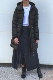 綾織ウールとマットナイロンを組み合わせたヘルノを代表するハイブリッドダウンコート。取り外し可能なフードを外せば、さらにエレガントに。スカートや今年トレンドのロングブーツとも好相性なロング丈。