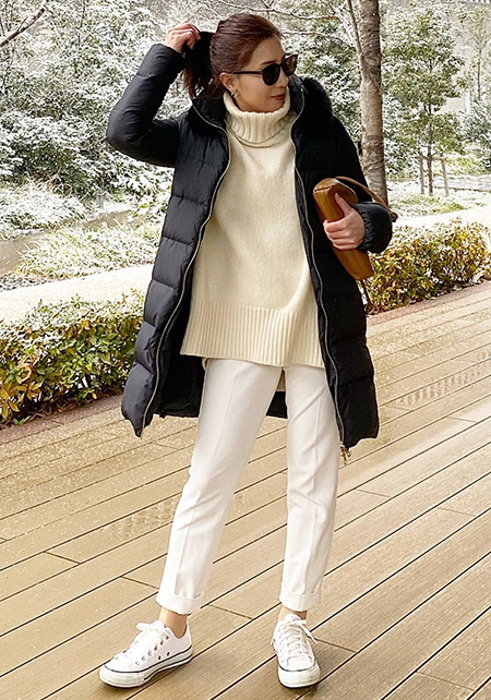 それぞれのアイテムがカジュアルでも、ホワイトベースのトーンでまとめれば、大人の女性らしさが感じられるコーディネートに。