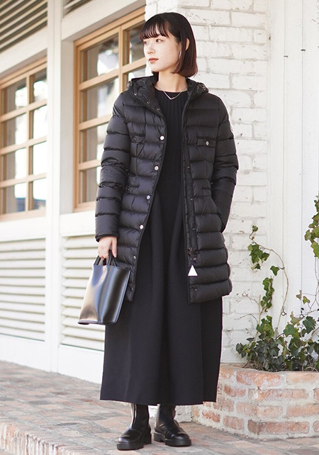 ウエストラインに“くびれ”を効かせたシルエットでシャープな女らしさを醸す定番モデル(ロングダウンコート)。