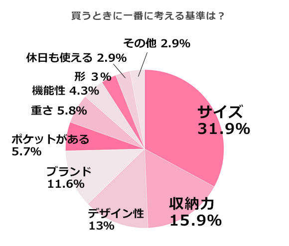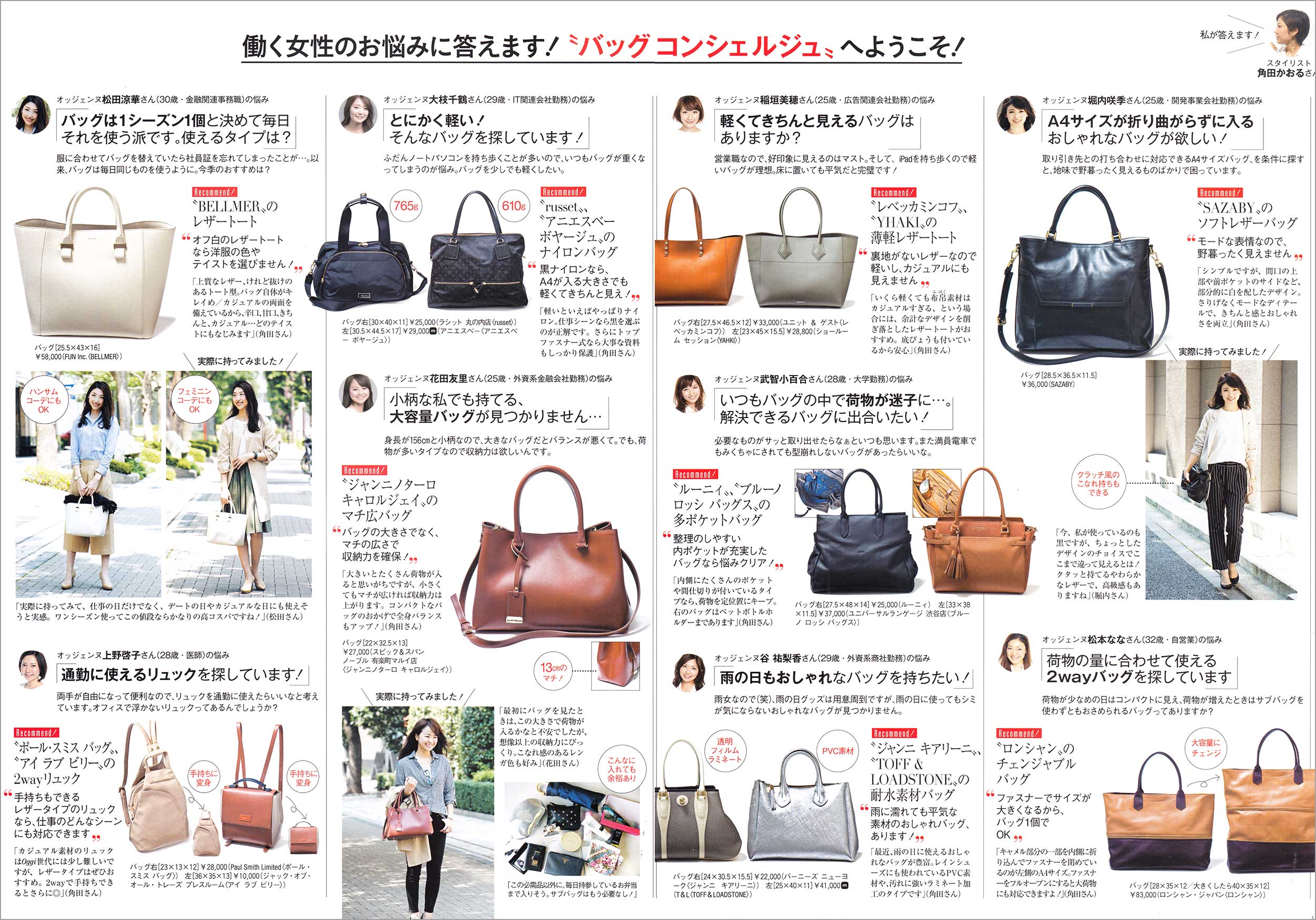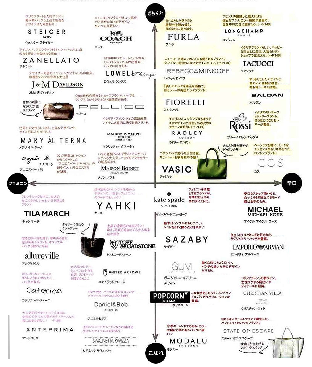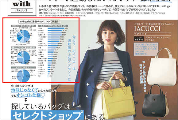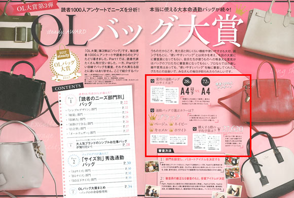働く女性(OL)さんが読むファッション誌「Oggi、Steady、BAILA、Domani、VERY、日経ウーマン」などに掲載された通勤バッグを元にしています。