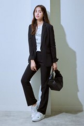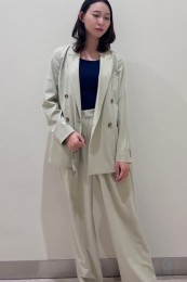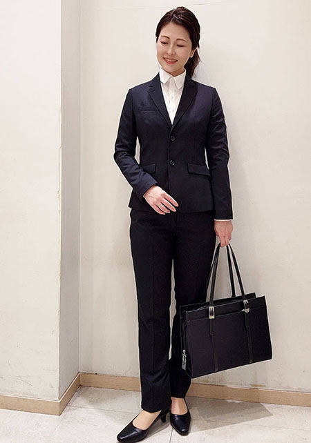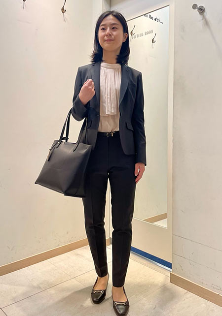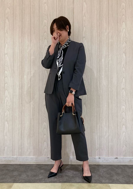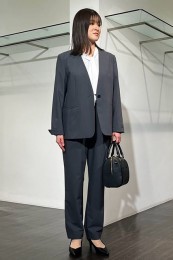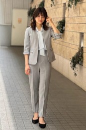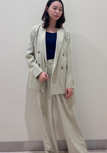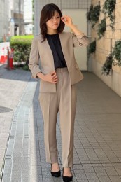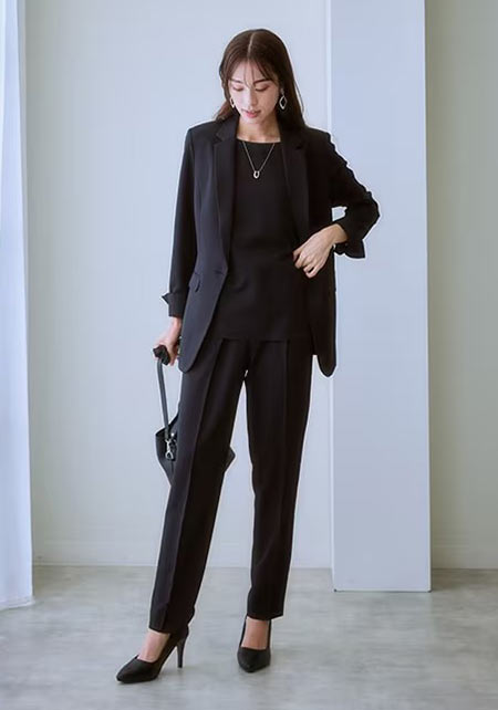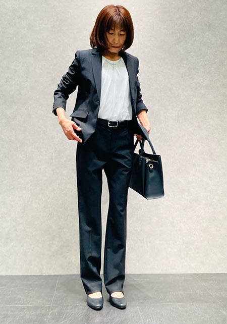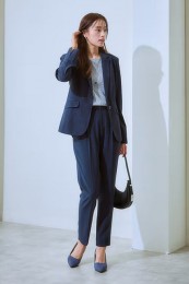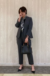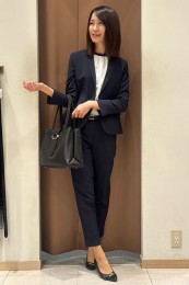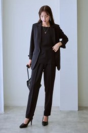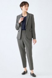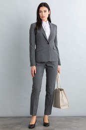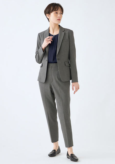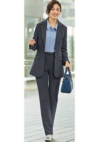 マニッシュな印象をあたえるパンツスーツ。ヒップがちゃんが隠れるジャケットの丈、脚を長く細く見せる美シルエットのパンツがセットになったロングセラーです。