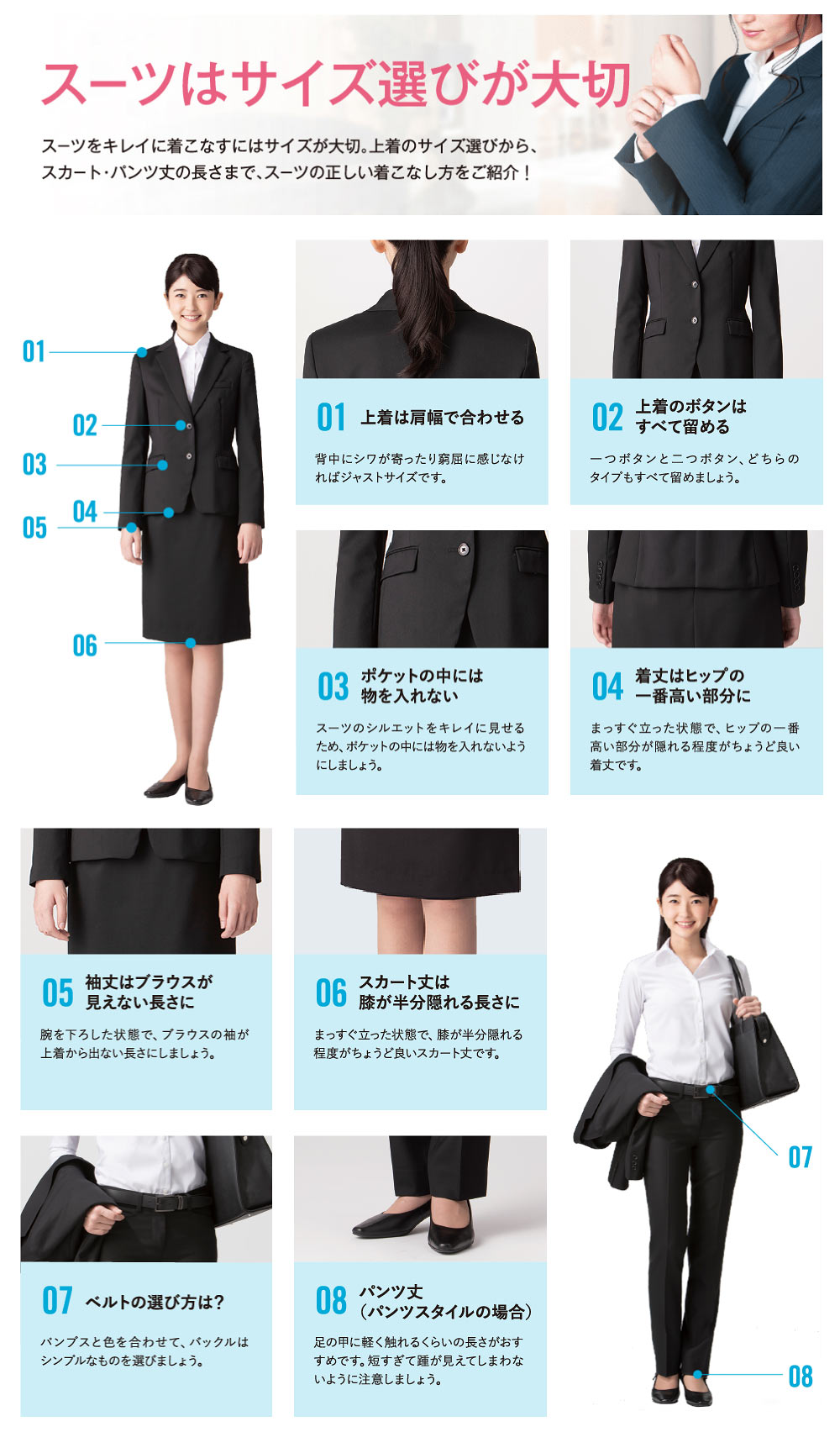スーツは身長が低い150cm~高身長の170cm以上までとってもサイズ・種類が多く、自分に合うサイズが無い…。とお悩みの方にもおすすめです!