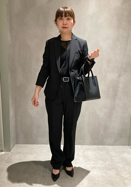 深みのある黒色×奥行きのあるシャドウ千鳥柄のシックエレガントなスーツ。飾らない大人っぽさが魅力的です。