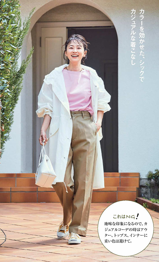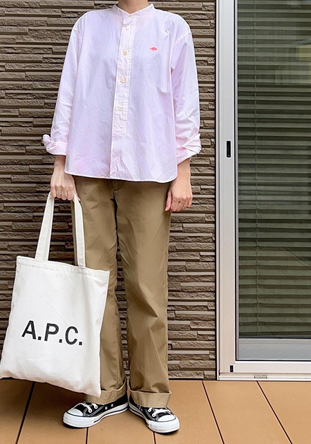 〈コーデ〉ピンクも、チノパンとなら甘さ控えめに大人になじむ。