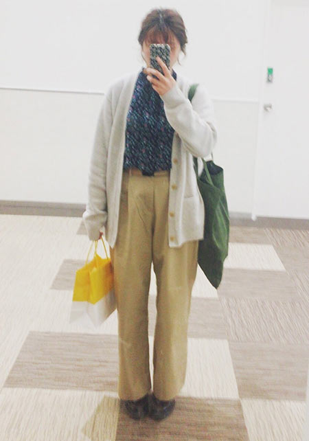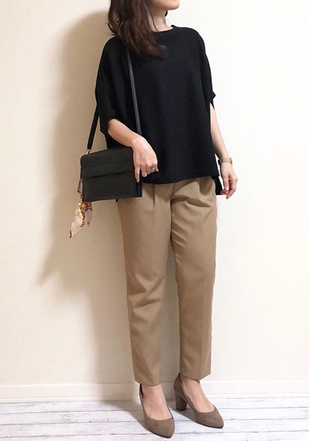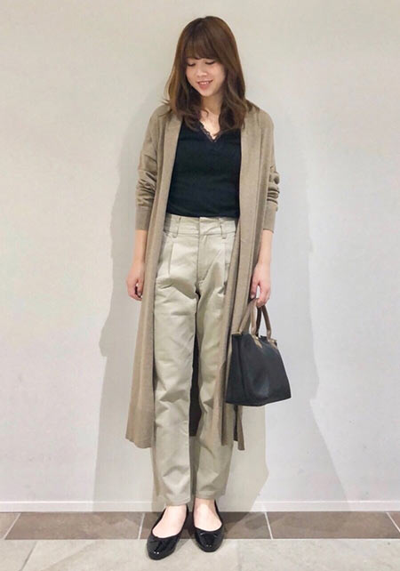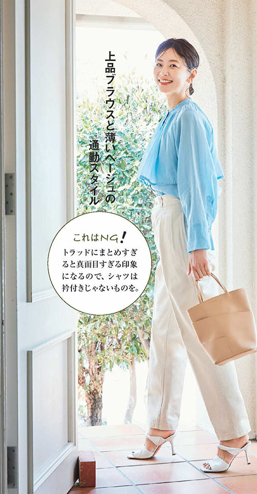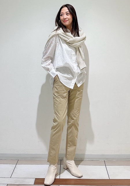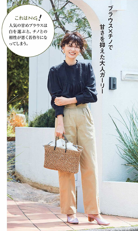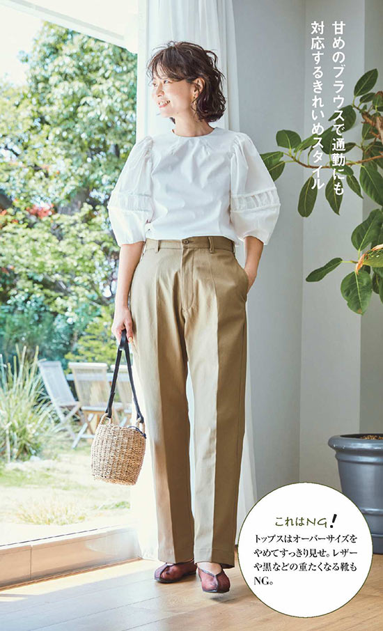 通勤などのかしこまった外出の時も、チノパンが活躍。薄い色やセンタープレスがよそ行き感を演出。透け感ブラウスにヒールを合わせて上品さを後押し