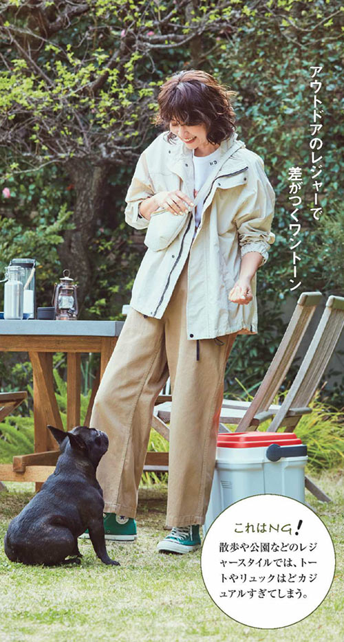 アウターやインナーをワントーンでまとめれば、清潔感が出て、公園でBBQなんて時にも洒落が出せる。スニーカーはベーシックカラーで引き締めて。