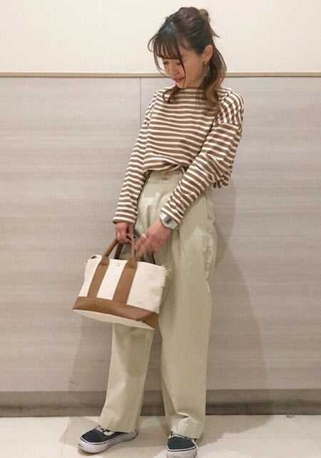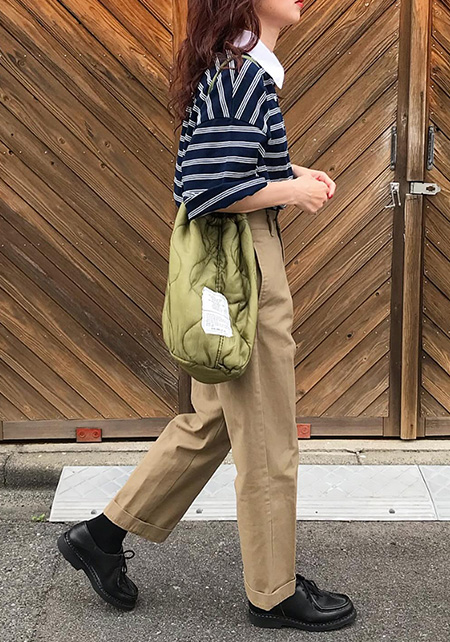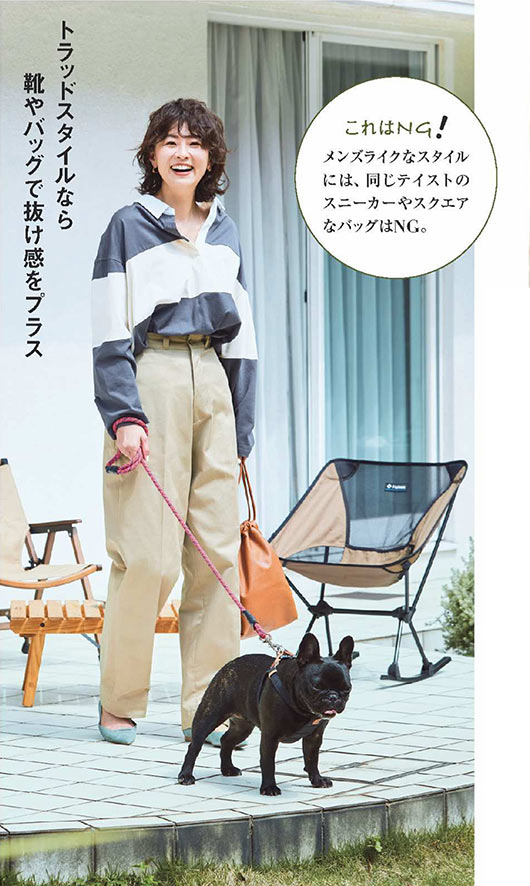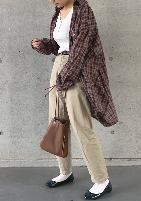 着こなせたら素敵なチノ×ラガーシャツのトラッド系コーデ。ポインテッドトゥのきれい色シューズと巾着バッグの旬な小物でブラッシュアップするのがポイント。