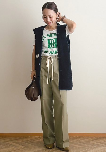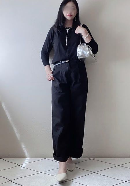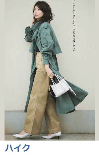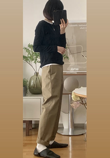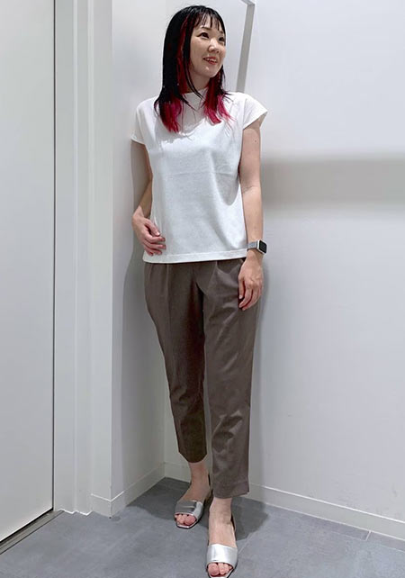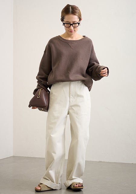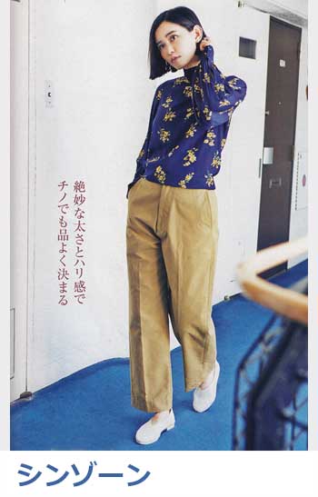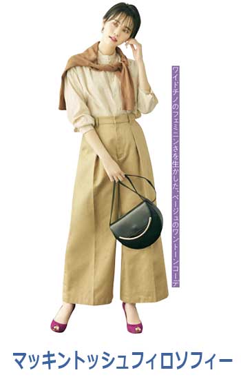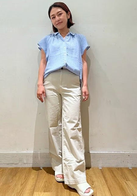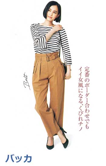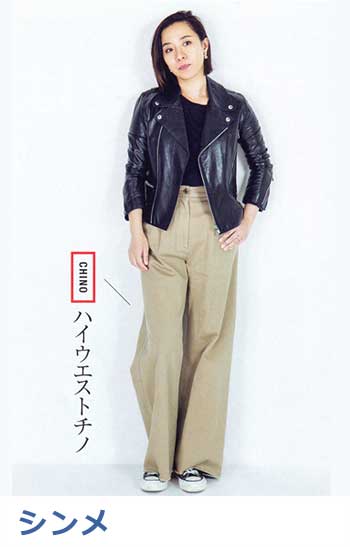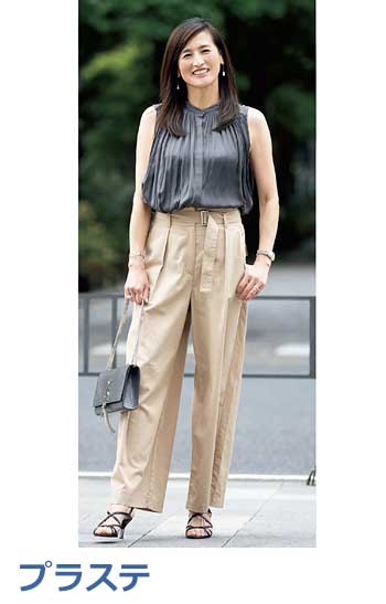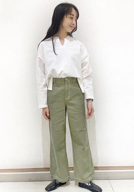 ブランドの定番ワイドデニムの「チノ生地バージョン」。上品な光沢のある生地はヒールに合わせやすく、センタープレスが縦ラインを強調。厚みもあってお腹やヒップをカモフラージュし、すっきりはけます。