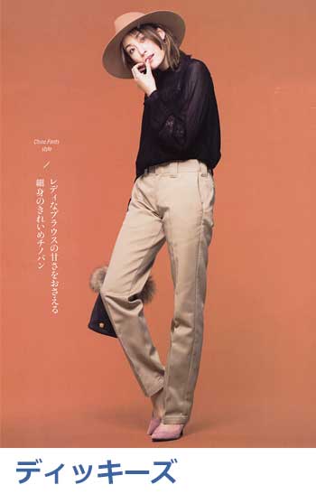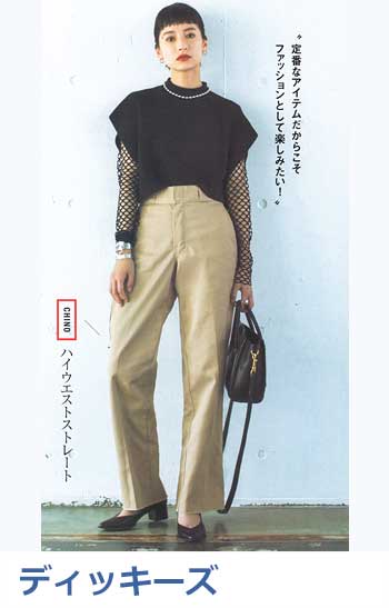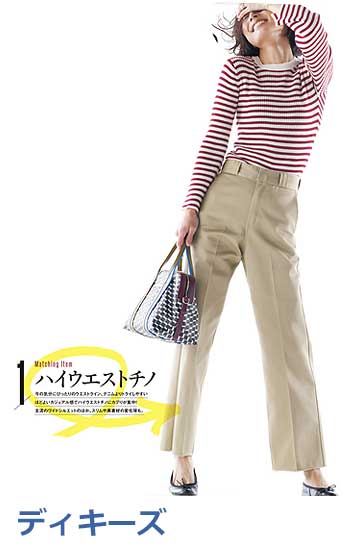 雑誌掲載多数!(STORY、VERY、InRed、LEE、mamagirl)、女性らしいきれいなシルエットが評判のチノ。太すぎず細すぎず絶妙な脚のラインと、腰まわりがスッキリ見えるハイウエストが魅力で、カジュアルなチノでも感度の高い着こなしが可能に。