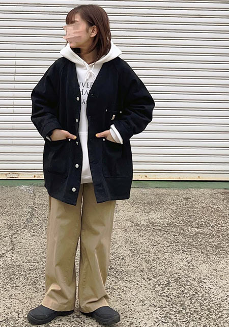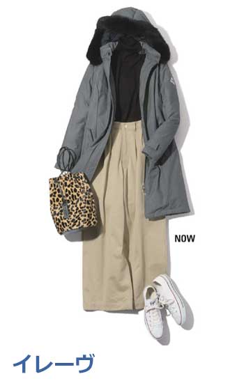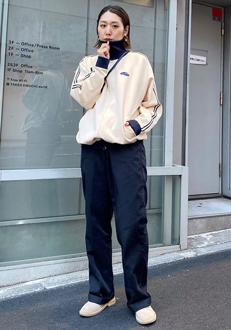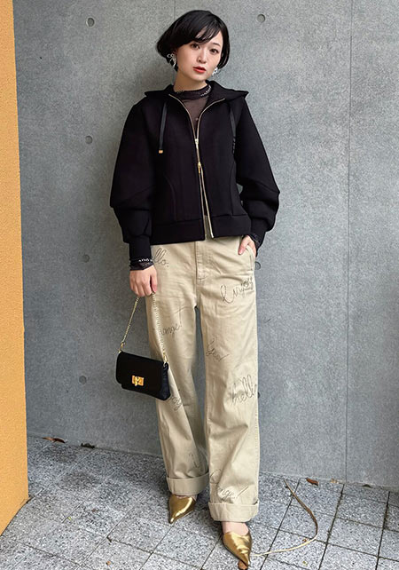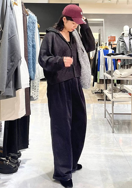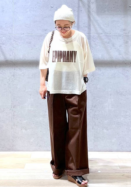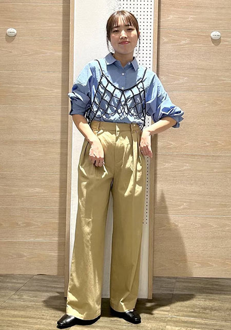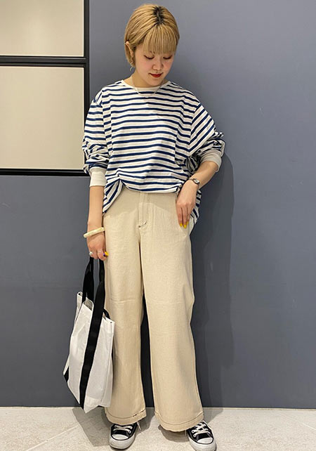 今年も定番のワイドチノは、ベイカーパンツのような大きなポケットが“ボーイッシュ”なアクセント。ウエスト後ろにはベルトデザインが付いていてワークな雰囲気も加味。