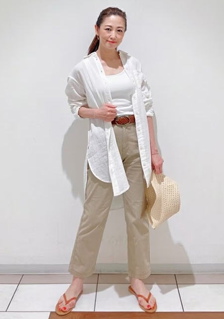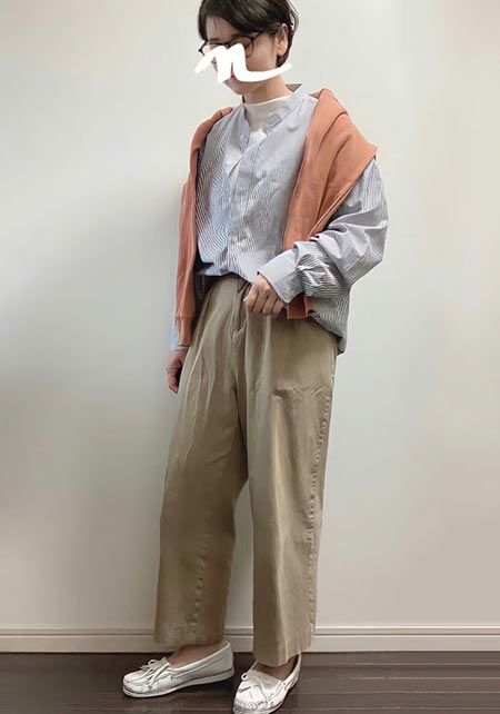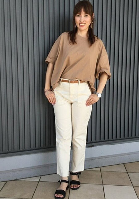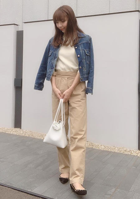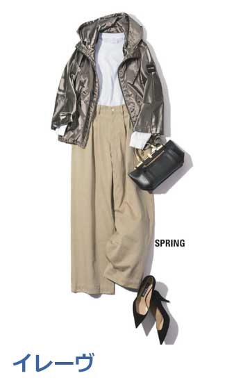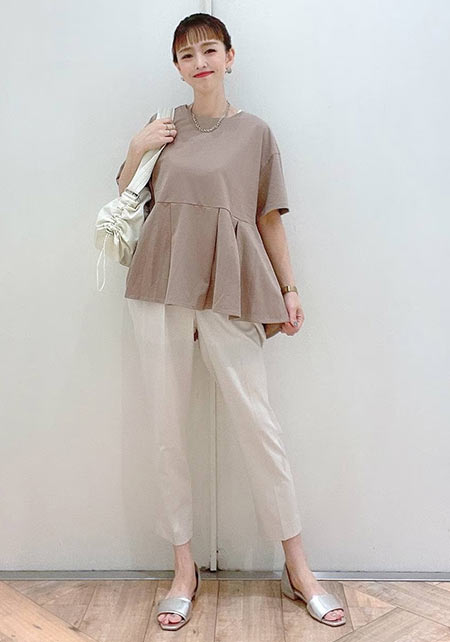 特に大人なら、色は落ち着きのあるベージュ系が推し。ここにほんのり女っぽいデザイントップスを合わせれば、サバ見えせずに素敵に更新できます!