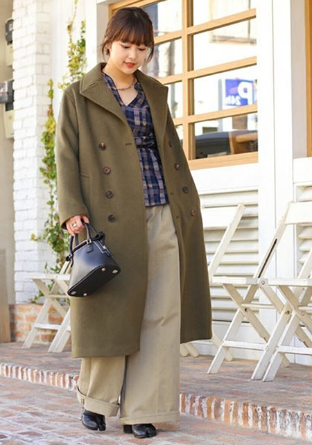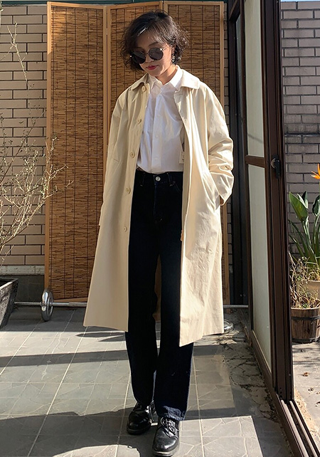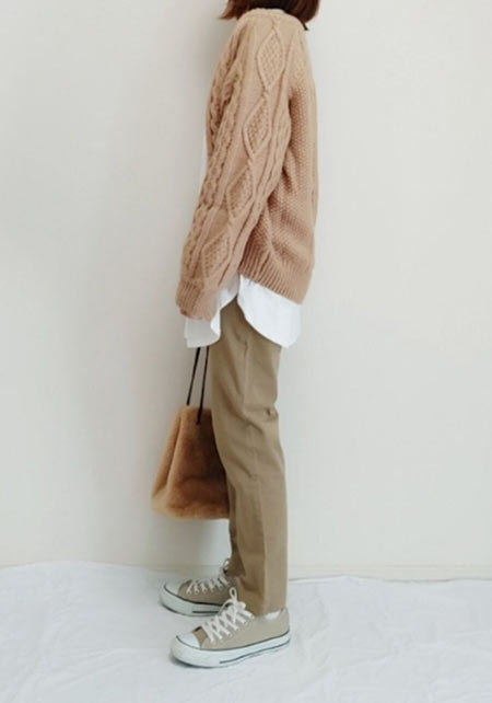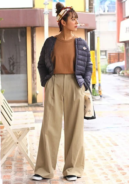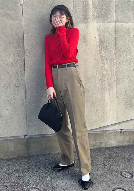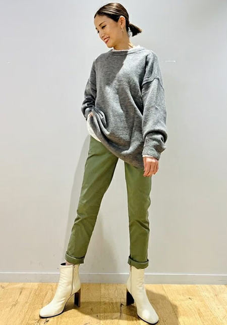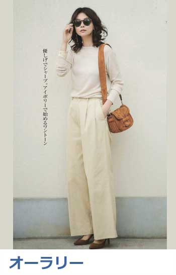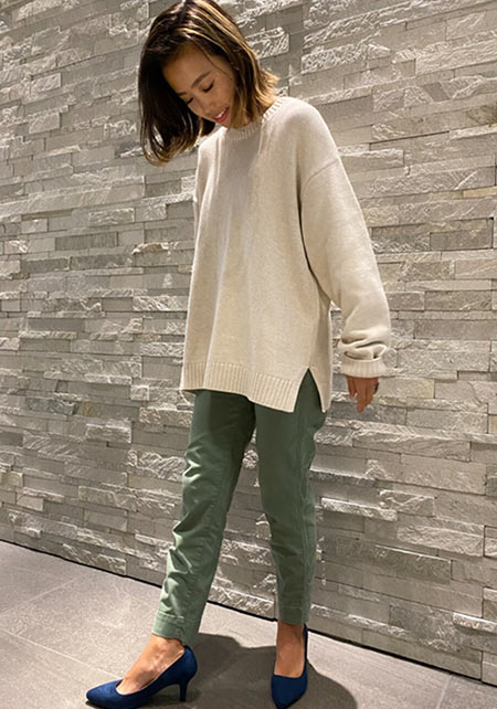 ワントーンコーデの人気は今季も健在。上下が同系色の場合ウエスト位置をうやむやにできるので、脚を長く見せることができます。