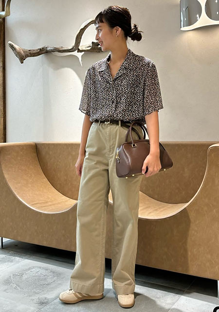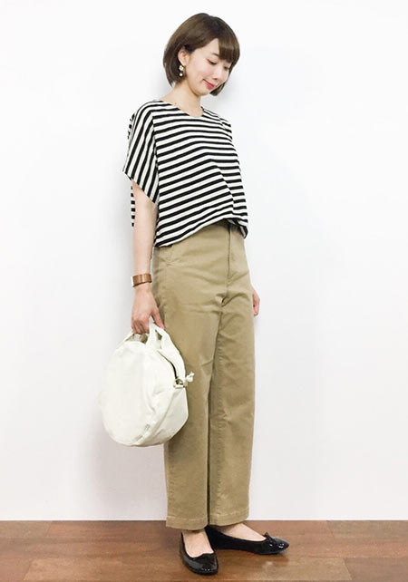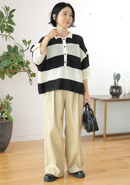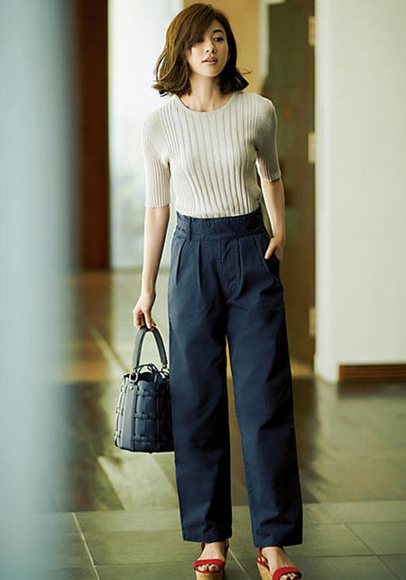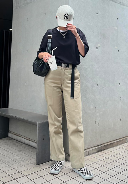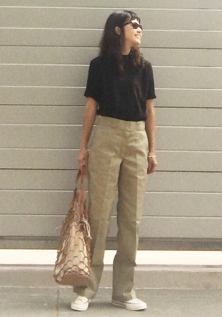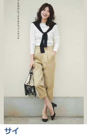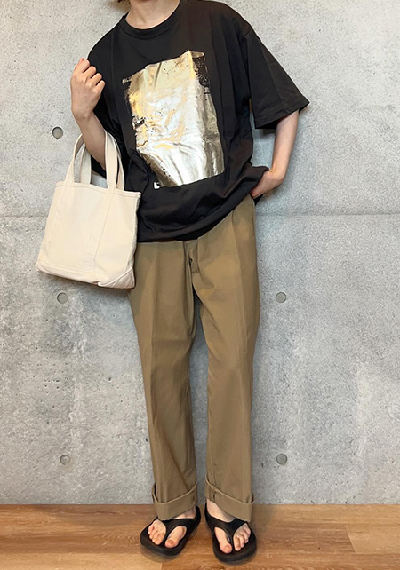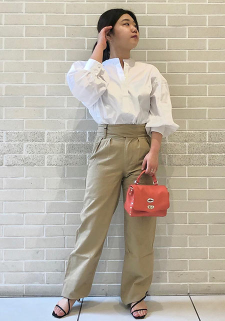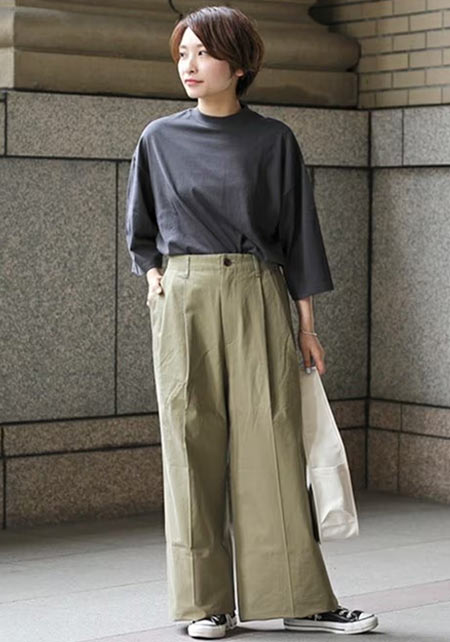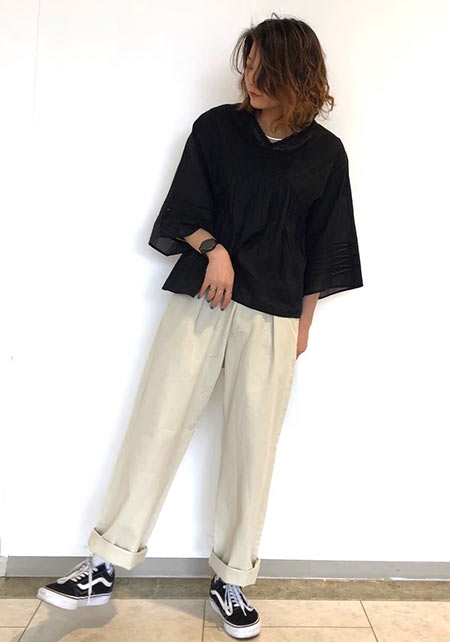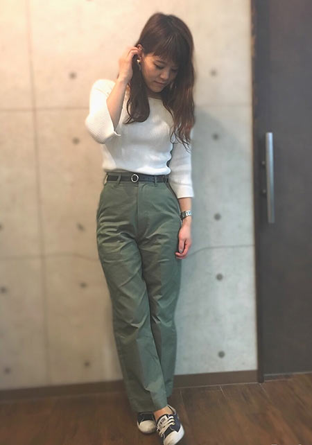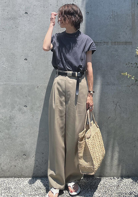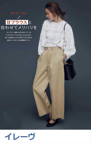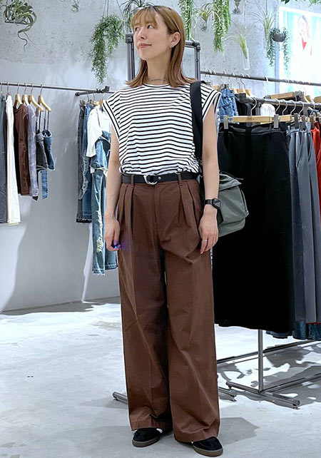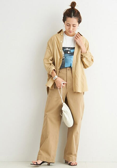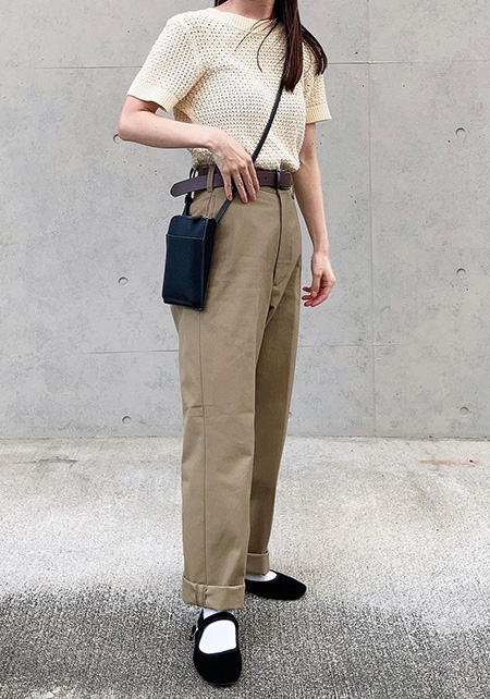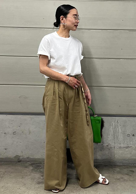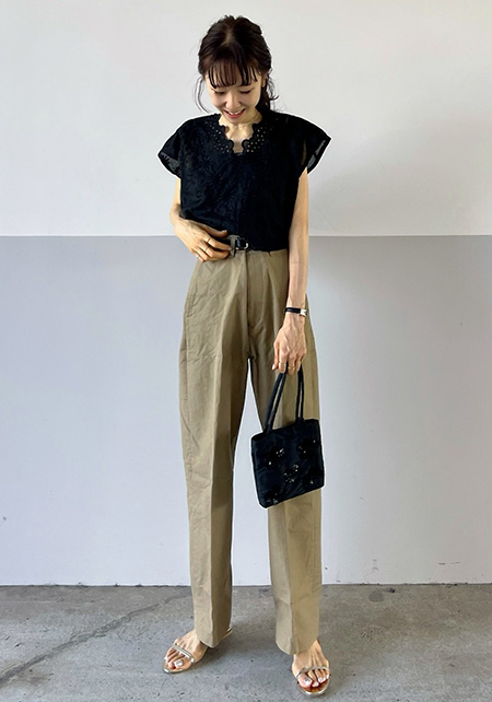 タック&センタープレスの洗練度でワンランク上のカジュアルが叶うチノ。クリーンでかっちりとしたワイドチノだから、デザイントップスで女っぽさや遊びゴコロを加えたい。