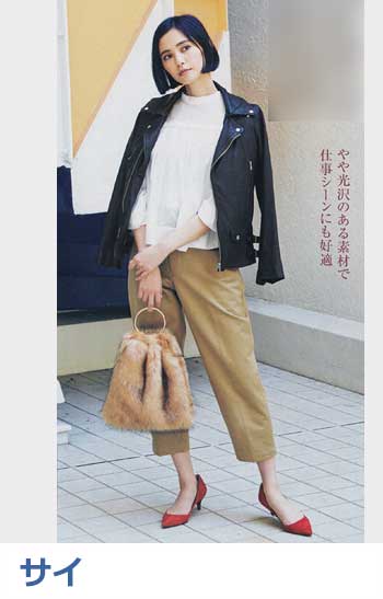 〈コーデ右〉スタンダードな上下に、ライダースを肩がけでON。カラーパンプスとファーバッグで遊び心を引き出して。大人的に落ち着く、白・黒・ベージュの上品配色。シャツをタックインすれば古く見えません。