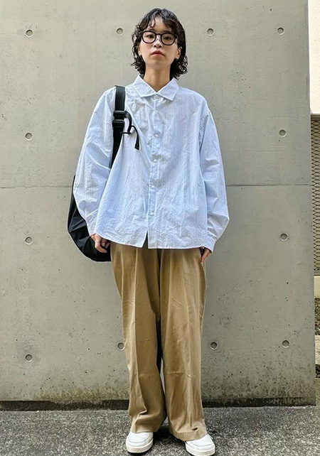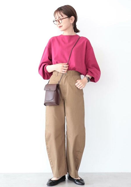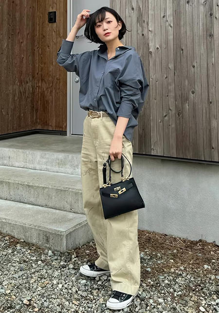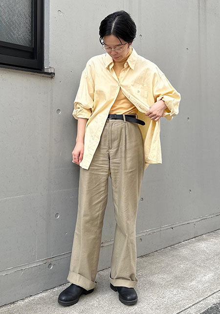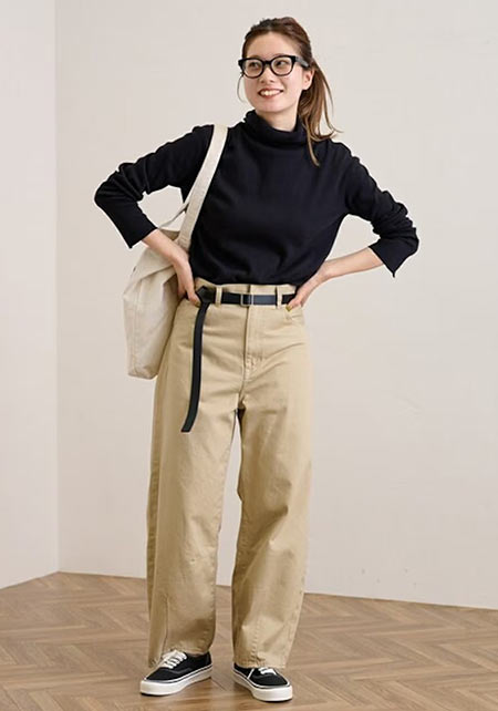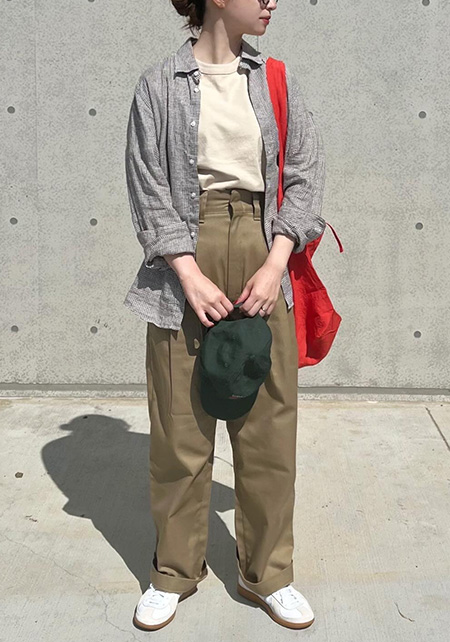 ワイド×太いロールアップデザインの個性的なチノパン。この組み合わせは太く見えがちですが、「ハイウエスト×ベルト」のスタイルアップ仕様で野暮ったさを払拭。小柄な人でも着こなしやすいです。また、少し厚みのある生地は1年中履けるし、ペラペラな安っぽさもなし!