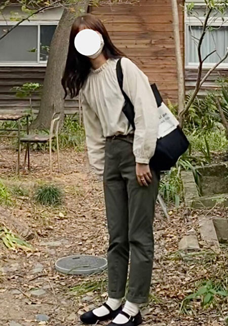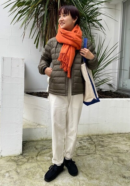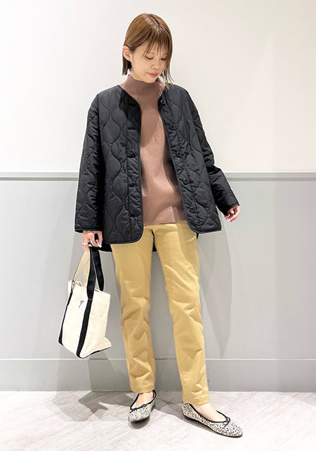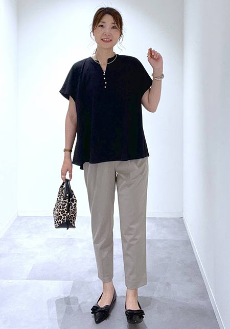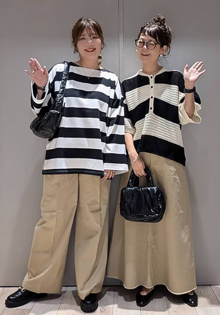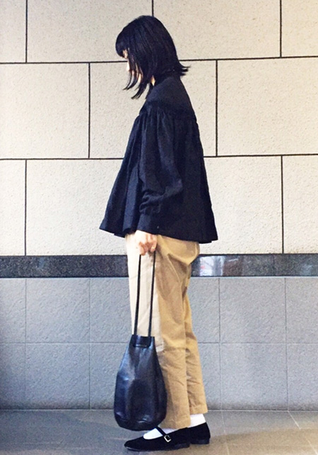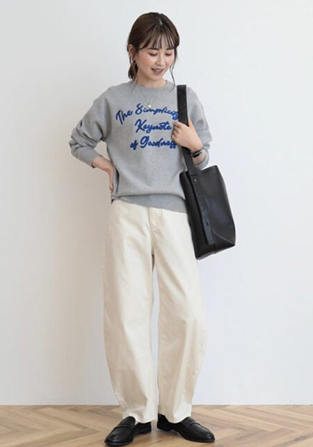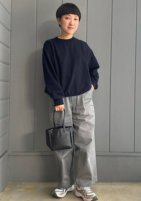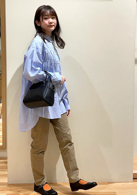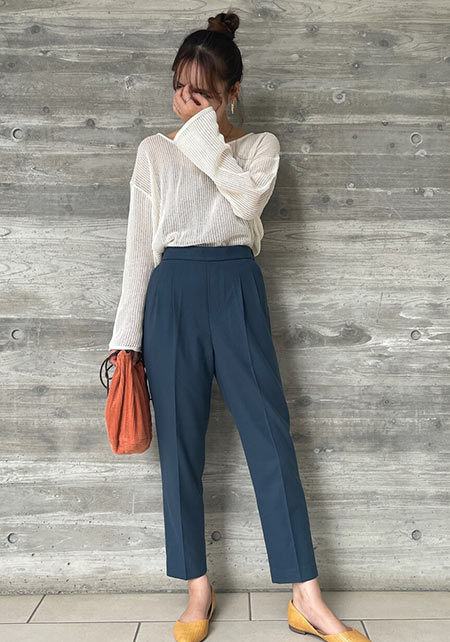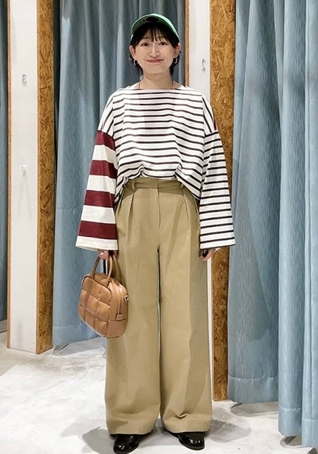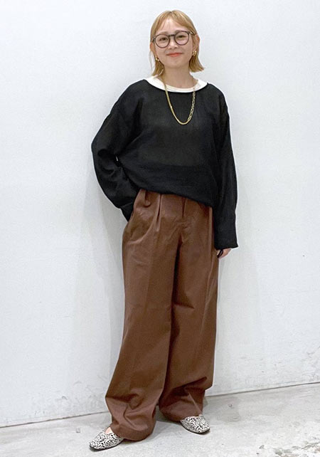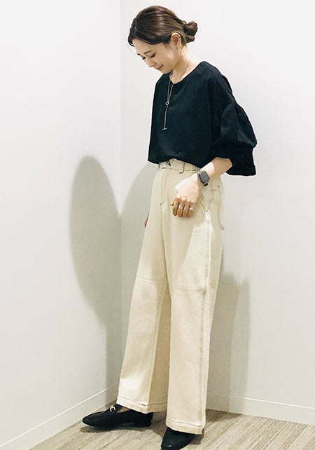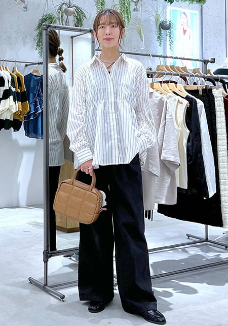 〈コーデ左〉ボリュームブラウスとも相性がよく、シルエットにメリハリをつけることでバランスがよくなります。