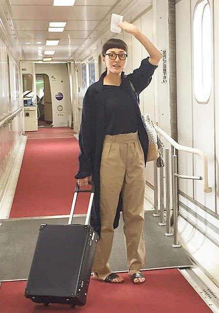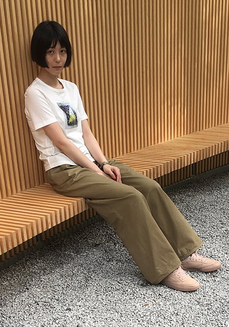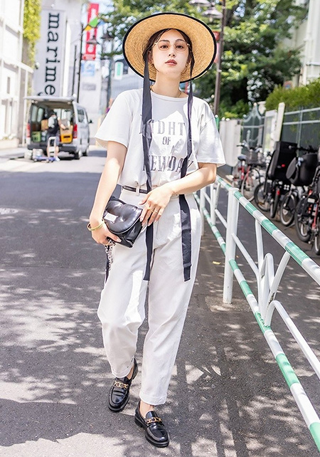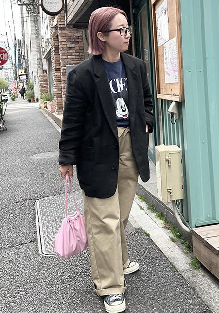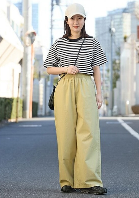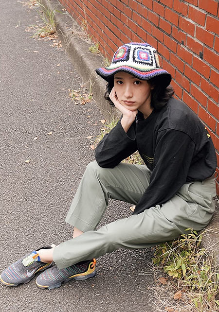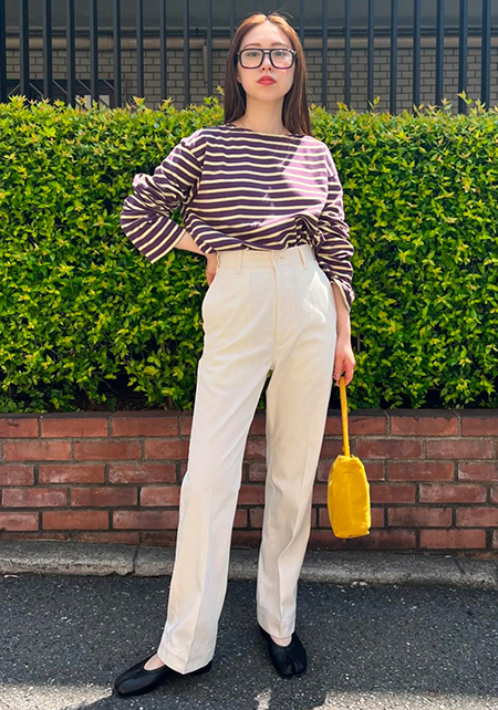 Tシャツの淡いピンク、スニーカーのイエローと、離れた場所に色を分散させてポイント作り。