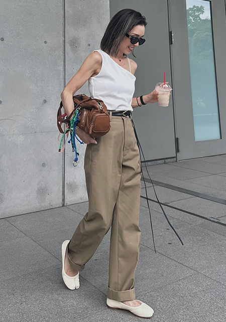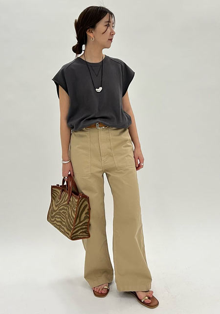〈コーデ〉迫力のあるワイドチノだから、デコルテの肌見せやビスチェで、女っぽさをのぞかせたい。