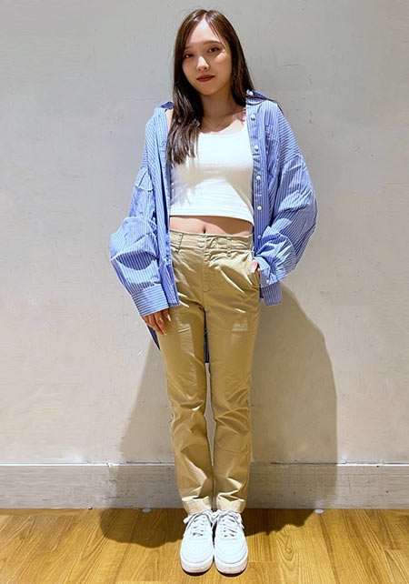 今っぽいハイウエストにストンと落ちるワイドストレート。旬のテイストを織り交ぜたモデルは、ウォッシュ加工による“こなれた風合い”もポイント。〈コーデ〉トレンドの女っぽいレースブラウスがどうも苦手! と敬遠する人も、チノパンに合わせればしっくりくるはず。