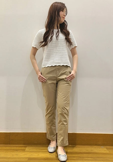 カジュアルな印象のチノパンも、白の甘めブラウスで明るい印象のさわやかな仕上がりに。メッシュ素材のシューズで夏らしい抜け感をプラス。