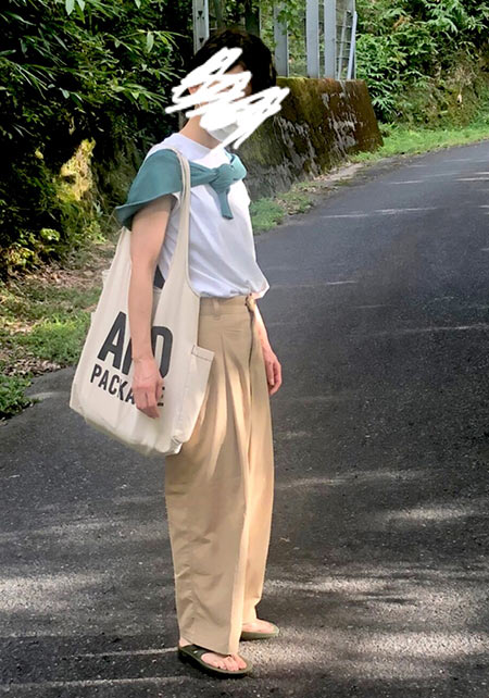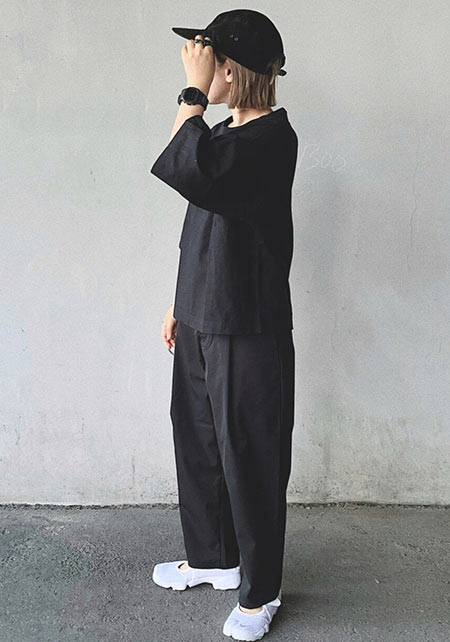 ヤエカの中では1番ゆったりとしているタック入りモデル。雰囲気にマッチする“柔らかな風合い”をもつオリジナルコットン生地を使い、とてもリラックス感たっぷり。でも野暮ったくないテーパードシルエットを採用しているから品の良さはキープ。