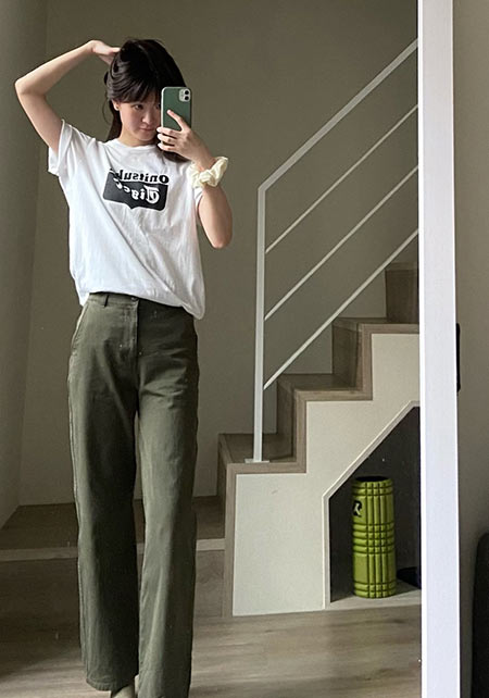 こちらは上記のワイドモデル。華奢なくるぶしをのぞかせて脚が細いと錯覚させる「アンクル丈」は、背が小さい人にもおすすめ。足の一番細いくるぶしを見せることで、抜けが出てコーデがスッキリ。〈コーデ〉ハイウエストぎみだからTシャツINも今っぽく着れます!