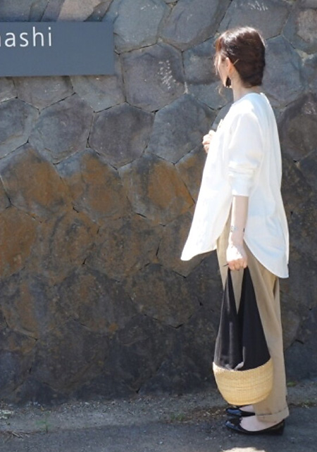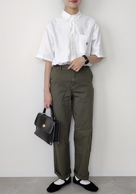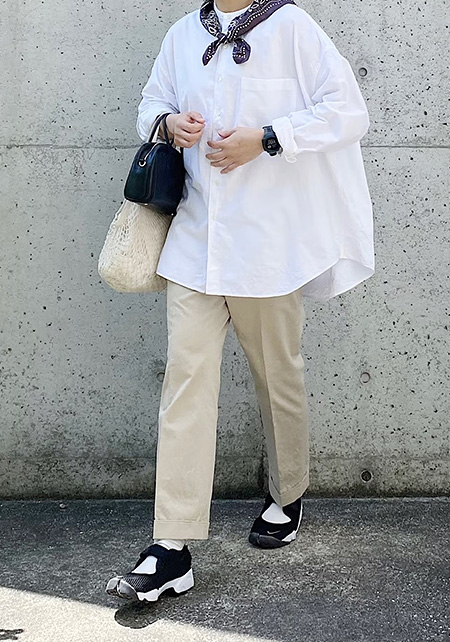 〈コーデ〉きちんとアイテムでまとめてお出かけ着にランクアップ。白シャツの裾は入れて、ジャストウエストで今っぽく。トップスとパンツのバランスが1:3になるように意識するとキレイ。