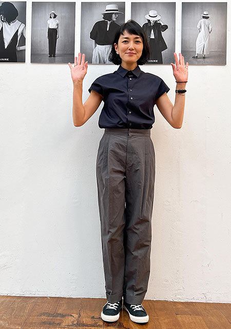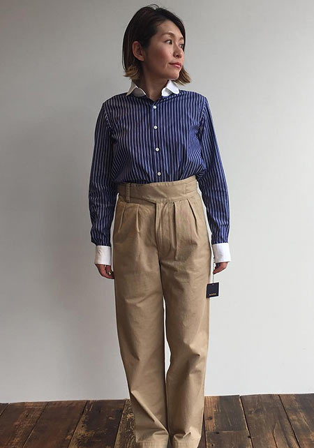 雑誌掲載も多い(STORY、mamagirl、クロワッサンなど)SNIMEのアイコン的チノパン。たっぷりとられたウエストのタックとウエスト回りのデザインが女らしい雰囲気。
