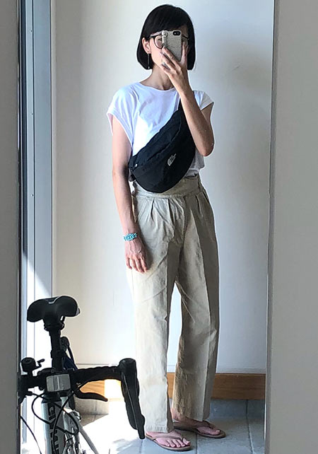 「今どきのチノ」という感じを印象づける深い股上とウエストマーク。シャツを合わせただけでも、単なる楽ちんボトムスとは一線を画した着こなしが完成します。