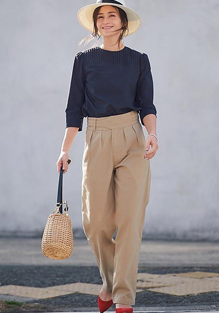 ウエストのベルトがあか抜けたパンツは、パンツ自体もどこか女性らしい雰囲気に。コンパクトながらも甘さのあるブラウスをプラスして女性らしく。