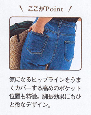 ストレッチ性のあるデニム地を使った「すっきり&はきやすい」、幅広い年代から支持される定番モデル。少し長めのレングスが綺麗な脚を演出。裾はカットオフに仕上げてトレンド感も加えてあります。