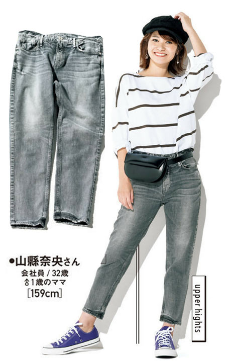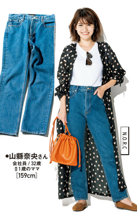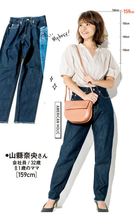平均的な身長で一番厚い層。デニム上手な人もいるけれど、体型に自信がなかったり、選び方がわからないという人も多数。そこそこの身長があるから、テーパードデザインや高め位置のブリーチ加工を選べば、実身長以上の脚長効果が叶います!
