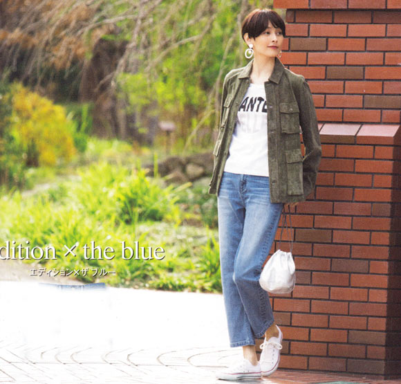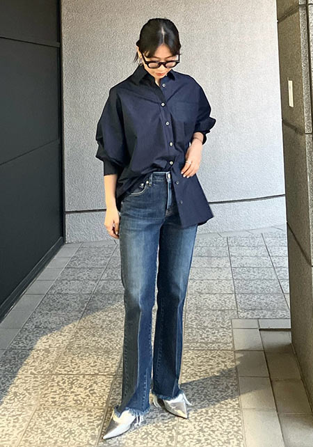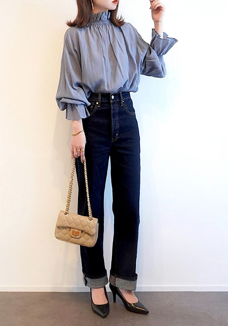 ブルーデニムは永遠のベーシックでありたいけれど、ハイウエストにすることで出るヒップは女性らしく、ペタンコでも脚長にも見せたい。足首がのぞく、前後差カッティングのバランスの良さを一度試してみて!