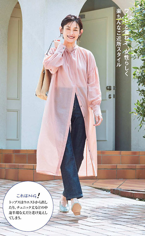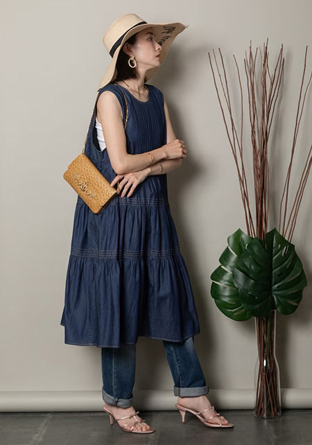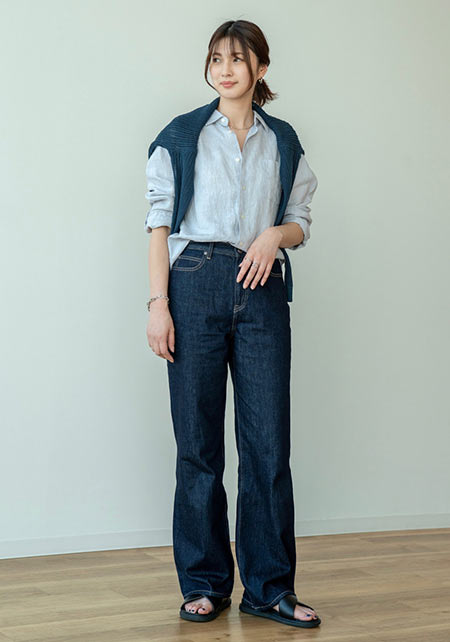 ワンピに重ねたときも腰まわりのラインがきれいに出るから、デニムがハイウエストであることは必須。膨張色の淡いブルーも脚長さんなら縦ライン効果で難なくはける。