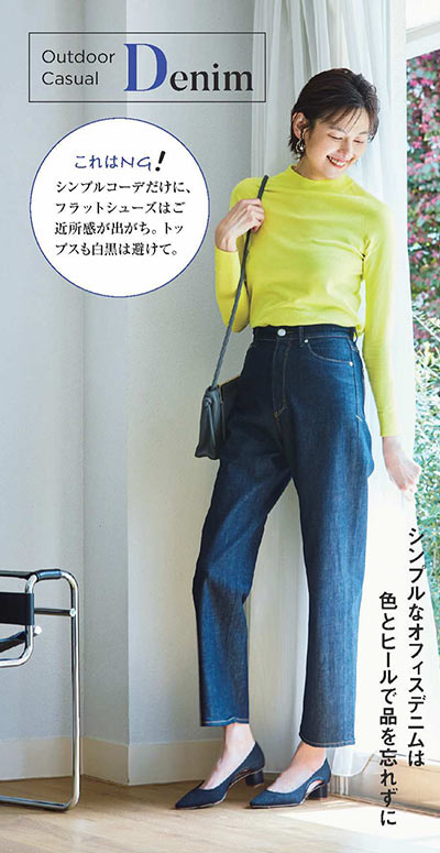 オフィスでのデニムもOKな今、デニムはこんな黒に近いインディゴが正解。シンプルになりすぎないようヒールと華やぐカラーがマスト。