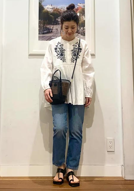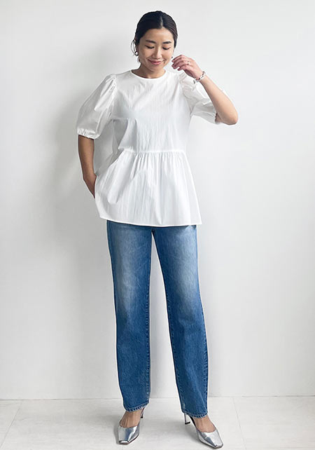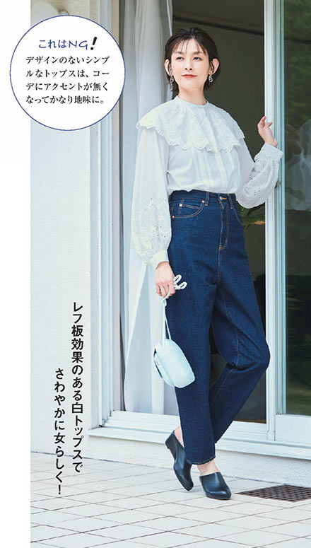チノと違い濃い色のデニムには、顔が明るく見える白トップスが似合う。デザイン衿ブラウスで今どきな雰囲気を出して。