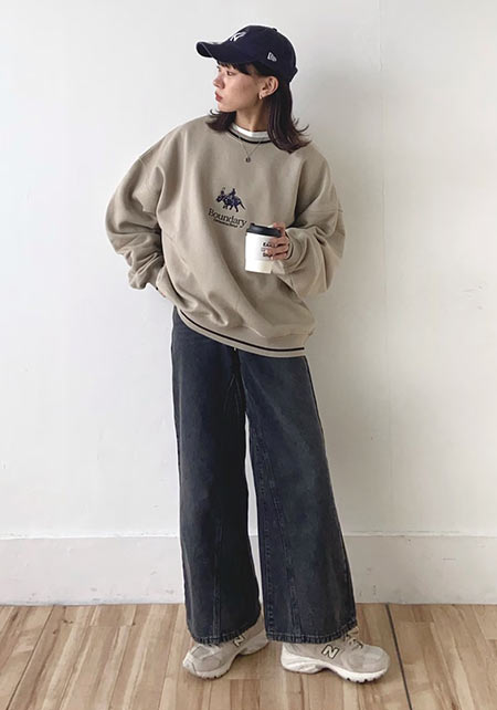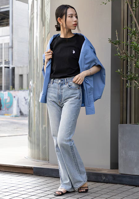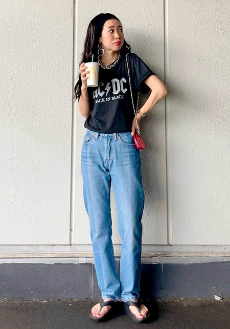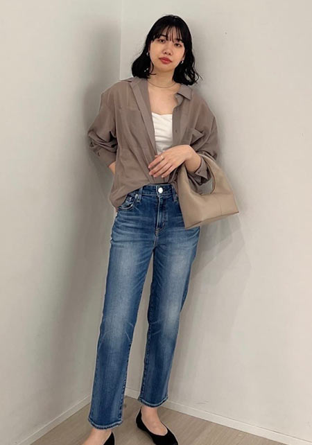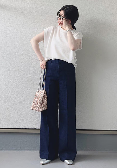高身長=脚長さんは、ふりきった股上深めのハイウエスト、太めデニムが今どきでかっこよくキマるポイント!もともと長い縦ラインがあるから、足首を出してスタイルアップを狙う必要がなく、フルレングスでさらに脚長を強調しちゃおう。
