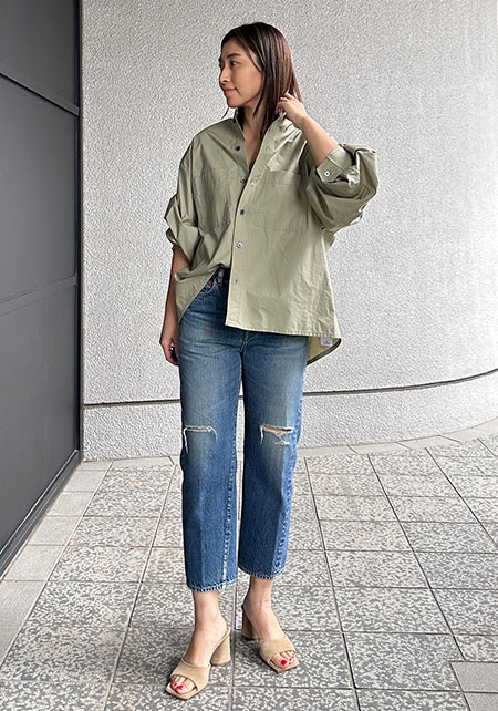 〈コーデ〉くるぶし丈のゆるスキニーには、シャツの裾を入れて全体的にスッキリと仕上げることで洗練された佇まいが生まれる。