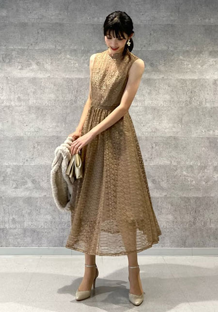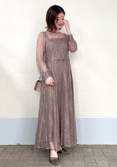 肌見せ度の高いキャミタイプは、はおりものをプラスしてデイ仕様にアレンジ。総レースのぜいたくな素材感に加えて、ボディにつかず離れずのシルエットやたっぷりとしたレングスで、シックなエレガントさが引き立ちます。