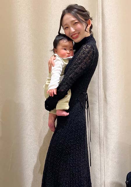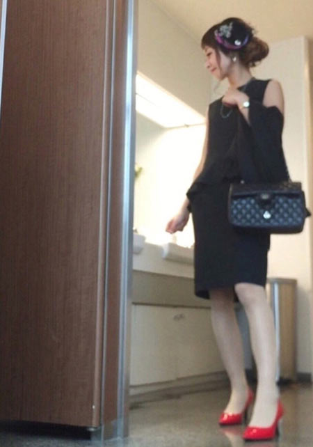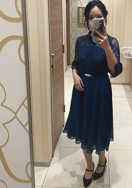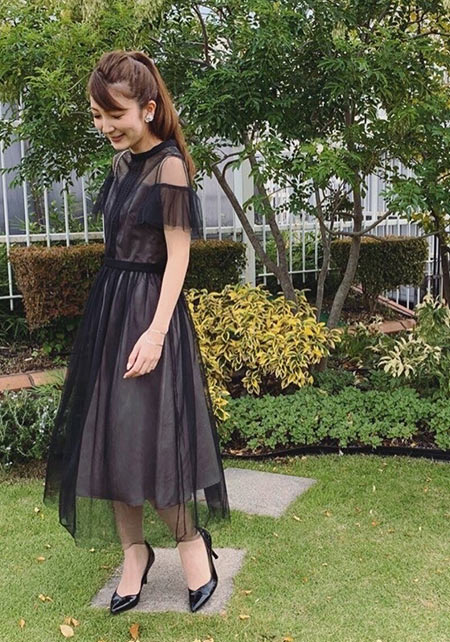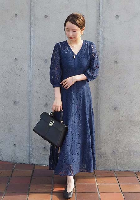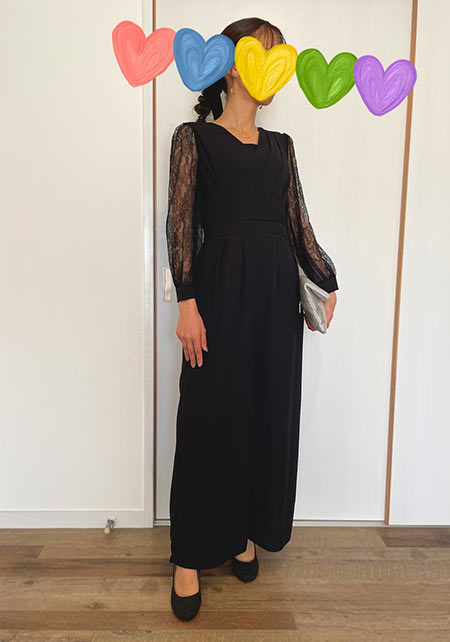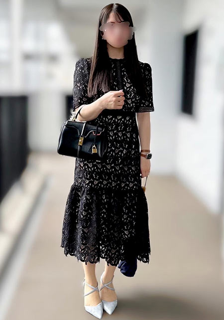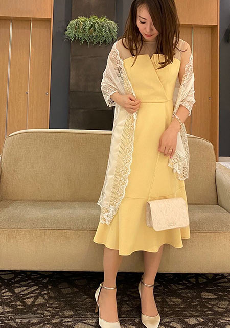 こちらは正装感のあるブラック。シンプルデザインとレースのチュール感で抜け感を漂わせ、甘くなりすぎないような仕上がりに。シックながら主役級のオーラでフェミニンとエレガントを両立。
