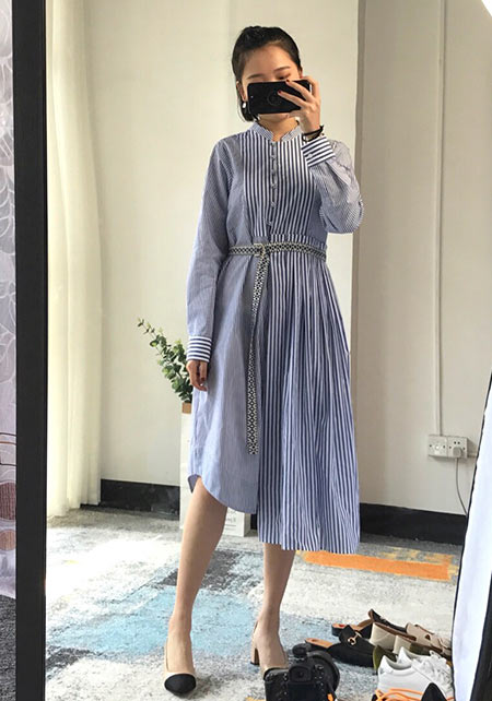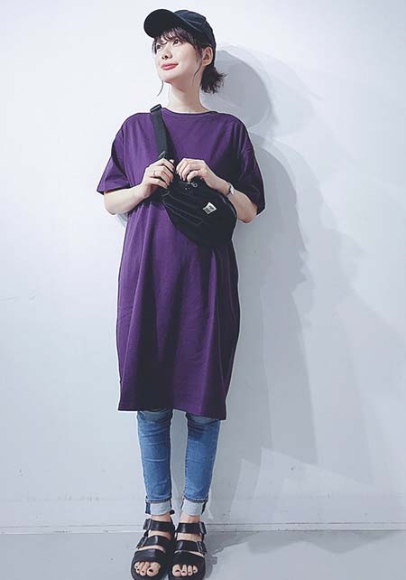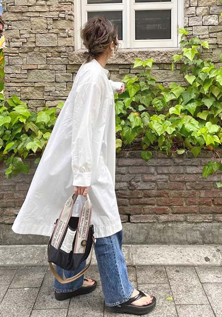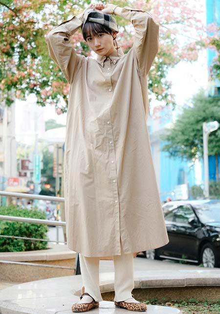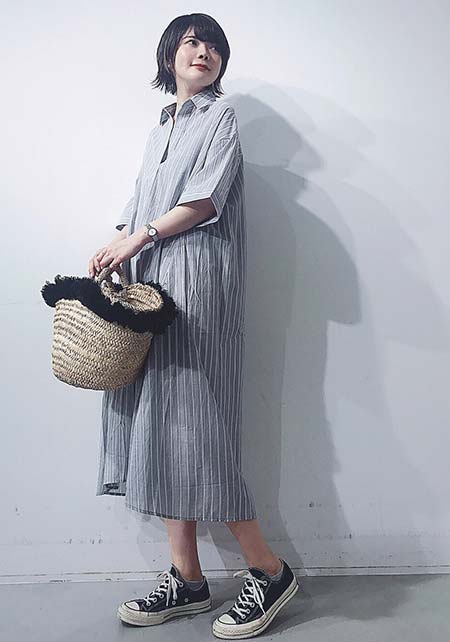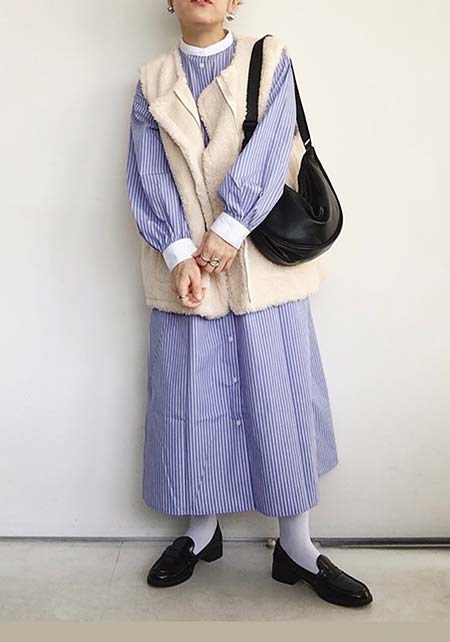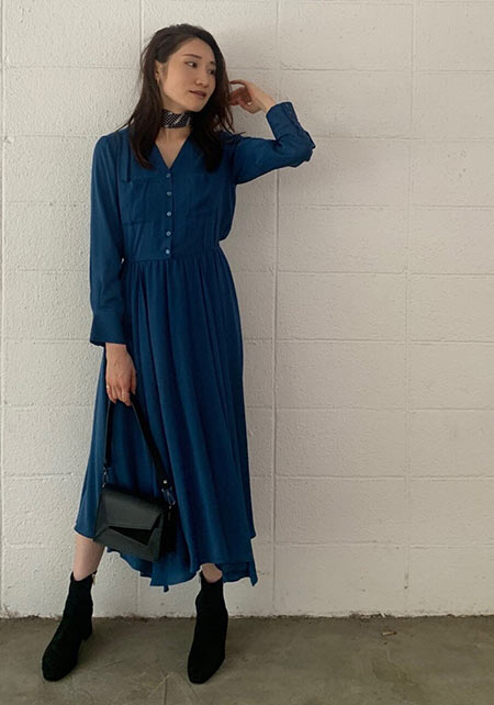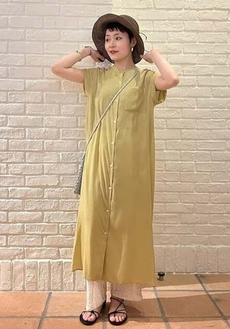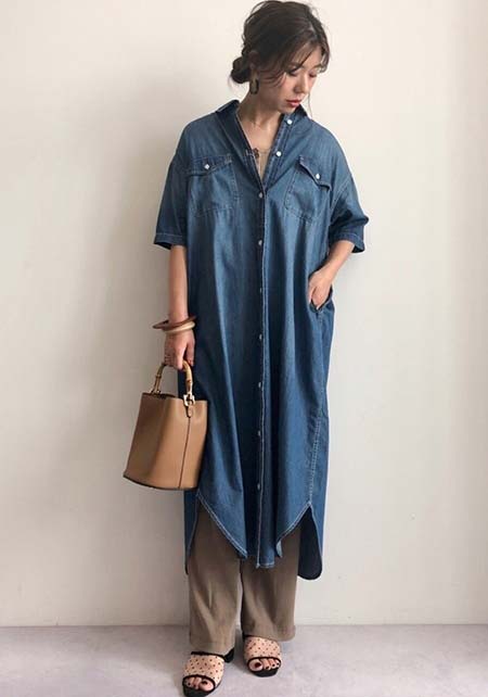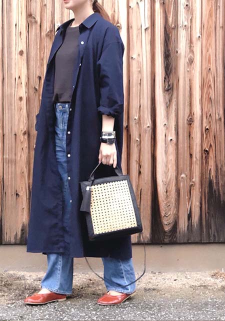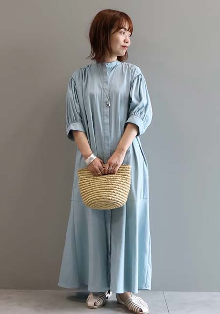 ミドル丈のシャツワンピを一枚でさらっと。この丈を素敵に着られるのはSサイズの特権。スモーキーなカラーで少し重みを持たせるのが好バランスです。