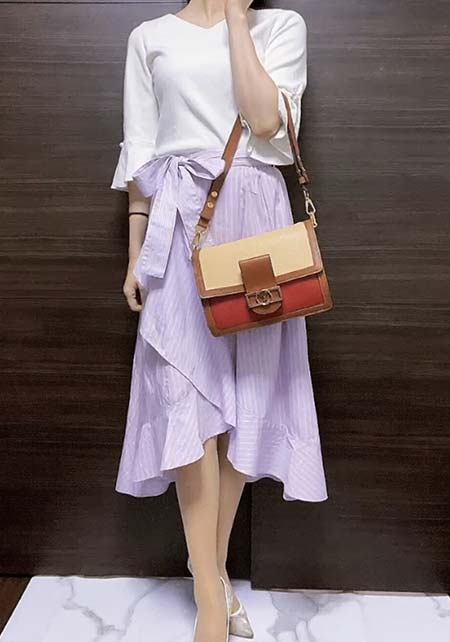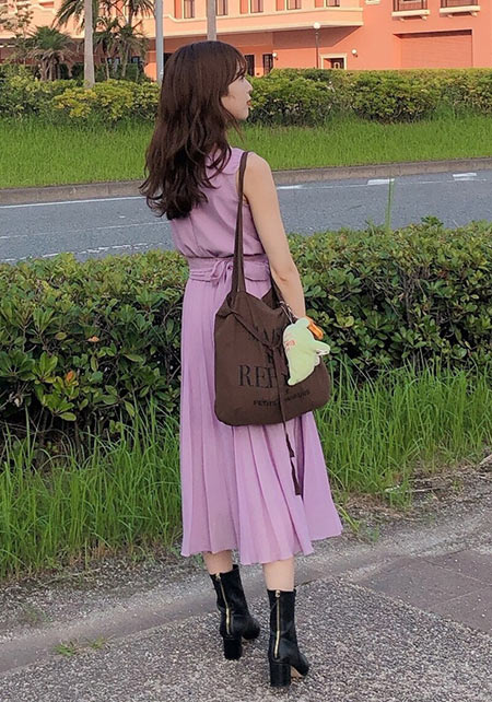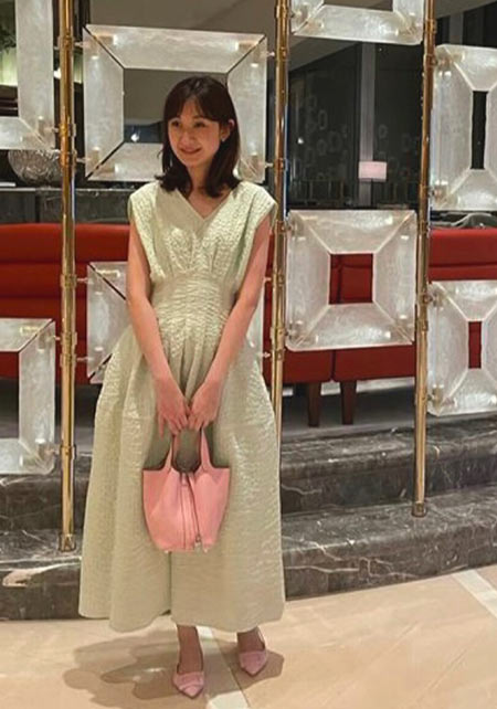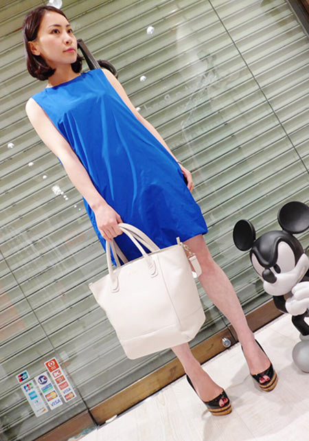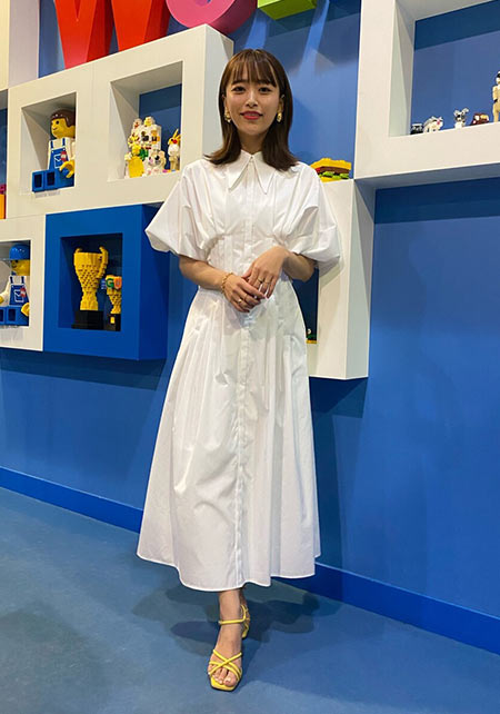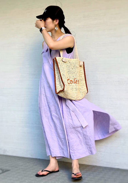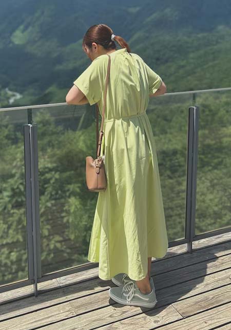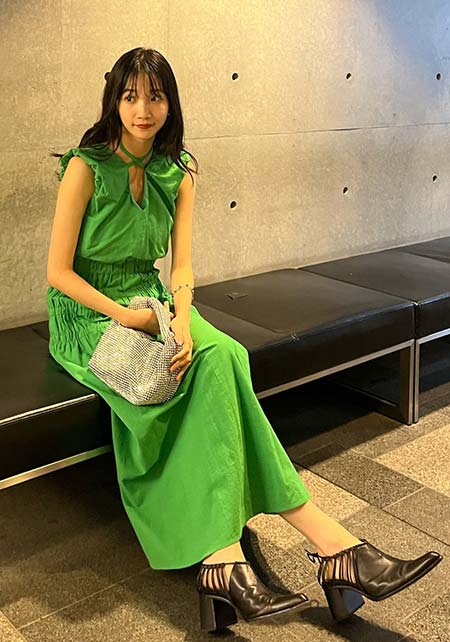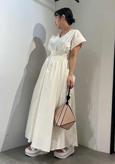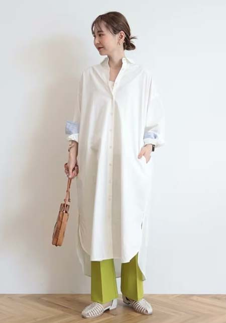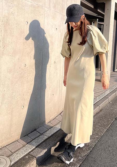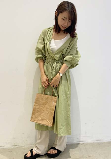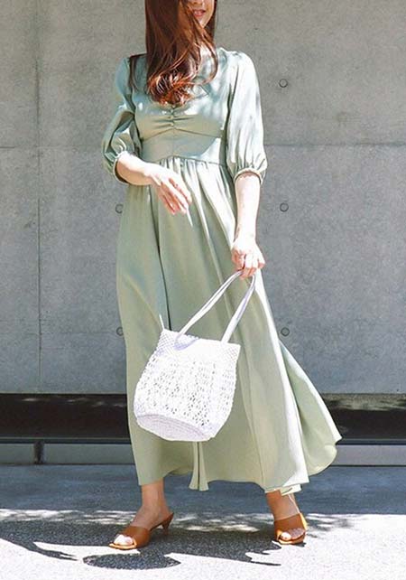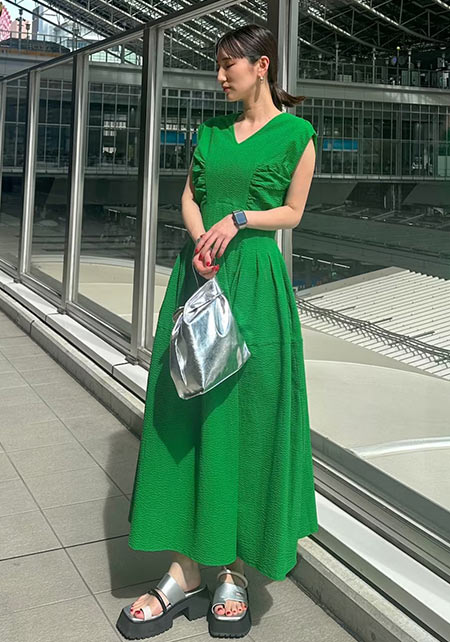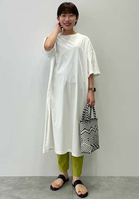 胸の下でくびれるよう設計されたスリムデザインで、脚長に見せてくれます。ライムグリーンは今季のトレンドカラー。ぼんやり見えないよう白のバッグで濃淡をつけて。ジャージー素材でシワにならないのも◎。